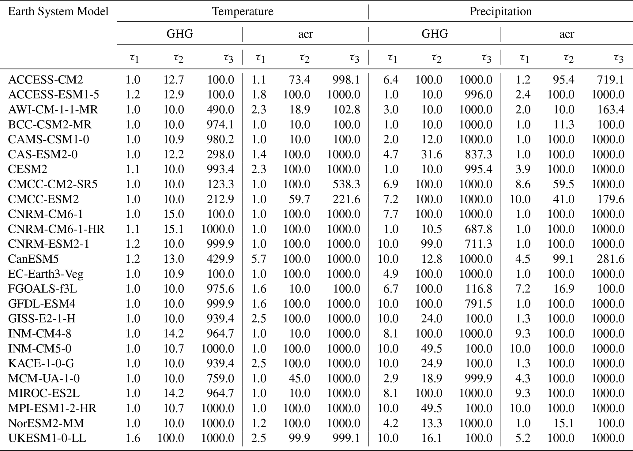 Additionally, in Appendix A we explore the effect and performance of the model for the abrupt4x-CO2 experiment and the historical and SSP2-4.5 experiment combination depending on the number of timescales used, showing that three timescales seem to yield good performance. Appendix B shows per model results including Table B1 which lists the values for the timescales obtained for GHG and aerosol response for Surface Air Temperature (tas) and Precipitation (pr) for each model and thus also serves as a reference of which models were included in the analysis.