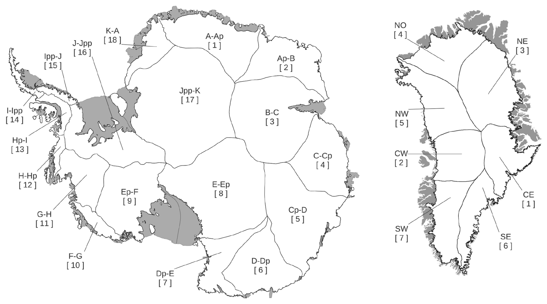 Figure 2Region names and numbers used in data products for each ice sheet. The Greenland regions from Mouginot and Rignot (2019) and Antarctic regions from The IMBIE team (2018). Product provided as part of this work in GeoPackage (vector) and NetCDF (raster) format, including zones flood-filled into the surrounding ocean, available at https://doi.org/10.5281/zenodo.14020895 (Mankoff et al., 2025a).