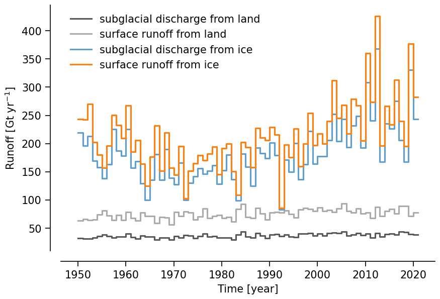 Greenland runoff from 1950 through 2023 at monthly resolution and by region (Fig. 3). The source data (Mankoff, 2020) has daily temporal and stream spatial resolution (Mankoff et al., 2020a) but is here resampled to monthly and regional resolutions. This product includes four variables that split the runoff by its two sources (ice sheet or peripheral land) and two destinations (fjord surface via sub-aerial stream or subglacial discharge at the bottom of marine-terminating glaciers). We assume climatological values prior to 1950.