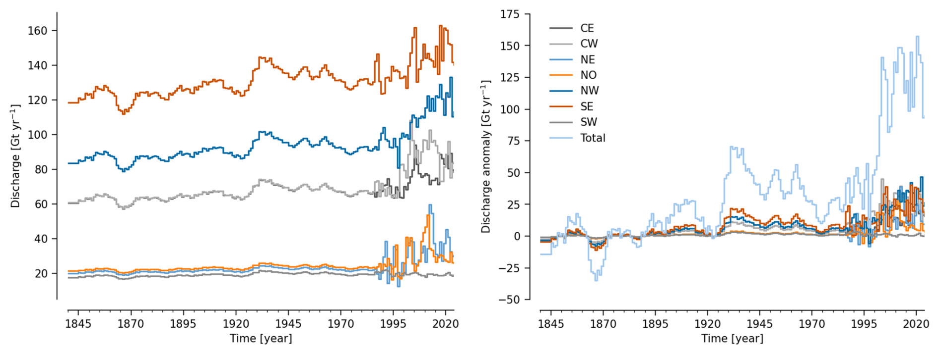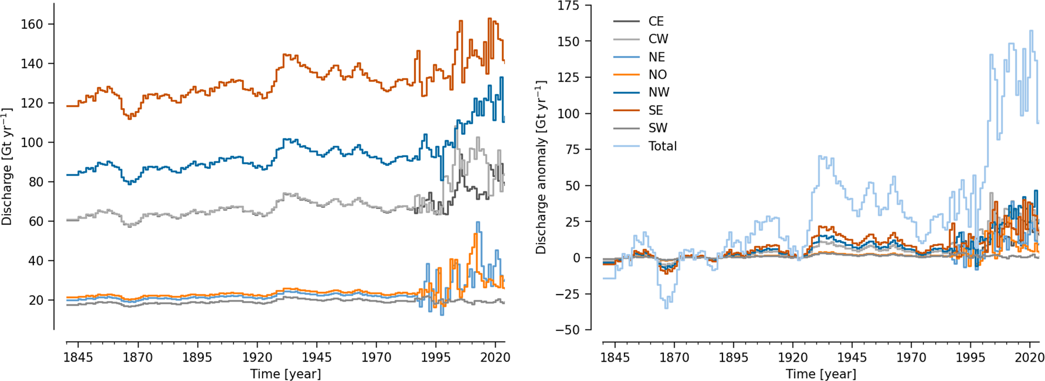 Figure 4Time series of Greenland (a) ice discharge, and (b) ice discharge anomaly (w.r.t. 1850–1900) (right) from flux-gates ∼ 5 km upstream of the terminus. This discharge is divided, roughly equally, into submarine melt and iceberg calving. Data post-1986 are from regionally-defined observations. Pre-1986, the data is derived from the total ice sheet changes, regionally partitioned based on the average of the first five years of regionally-defined observations. Product provided as part of this work available at https://doi.org/10.5281/zenodo.14020895 (Mankoff et al., 2025a).