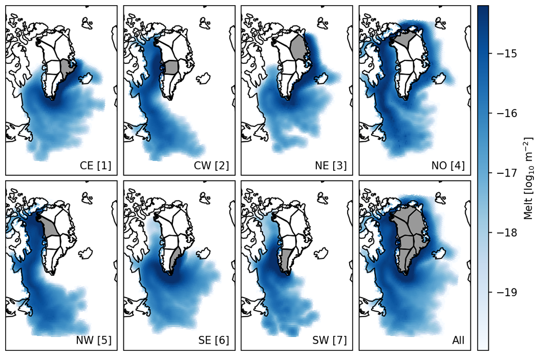 Figure 5Maps showing the annual average iceberg melt rates as a function of their source region in Greenland. Similar maps with monthly resolution are also available. Each map multiplied by cell area and summed equals one, so that these can be used for distributing freshwater inputs computed elsewhere. See Fig. 2 for region names and numbers. Product provided as part of this work available at https://doi.org/10.5281/zenodo.14020895 (Mankoff et al., 2025a).
