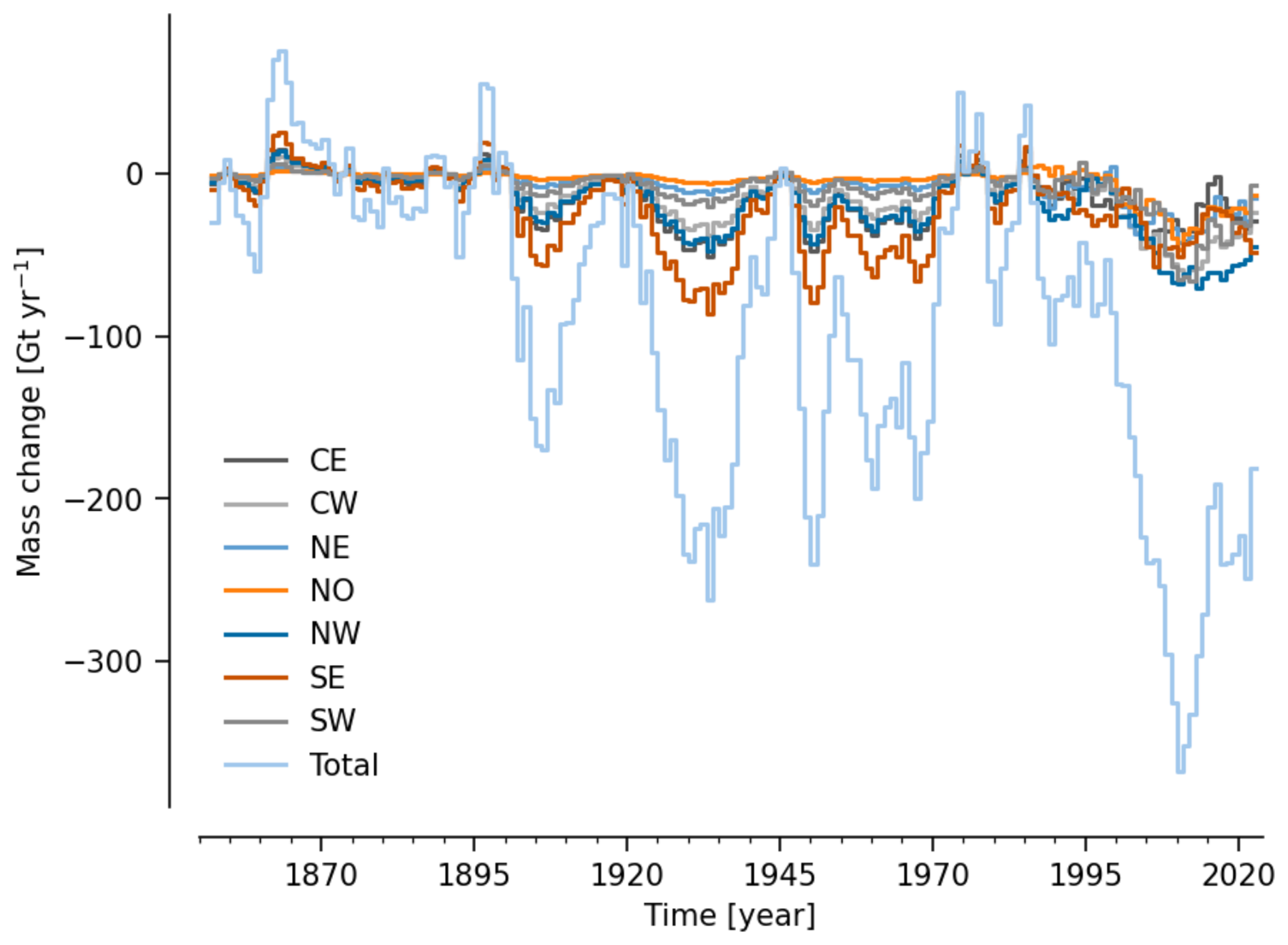 Figure 6Greenland mass anomaly per region. Product provided as part of this work available at https://doi.org/10.5281/zenodo.14020895 (Mankoff et al., 2025a).