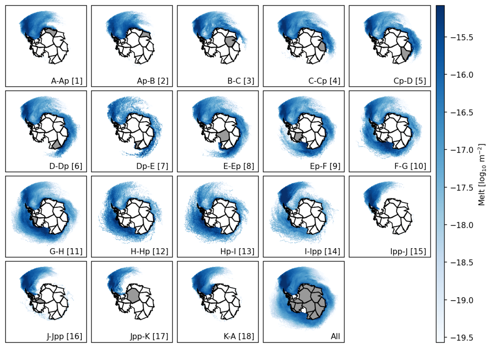Figure 7Maps showing the annual average weighting function for iceberg melt rates as a function of their source region in Antarctica. Similar maps with monthly resolution are also available. Each map multiplied by cell area and summed equals one, so that these can be used for distributing freshwater inputs computed elsewhere. See Fig. 2 for region names and numbers. Product provided as part of this work available at https://doi.org/10.5281/zenodo.14020895 (Mankoff et al., 2025a).