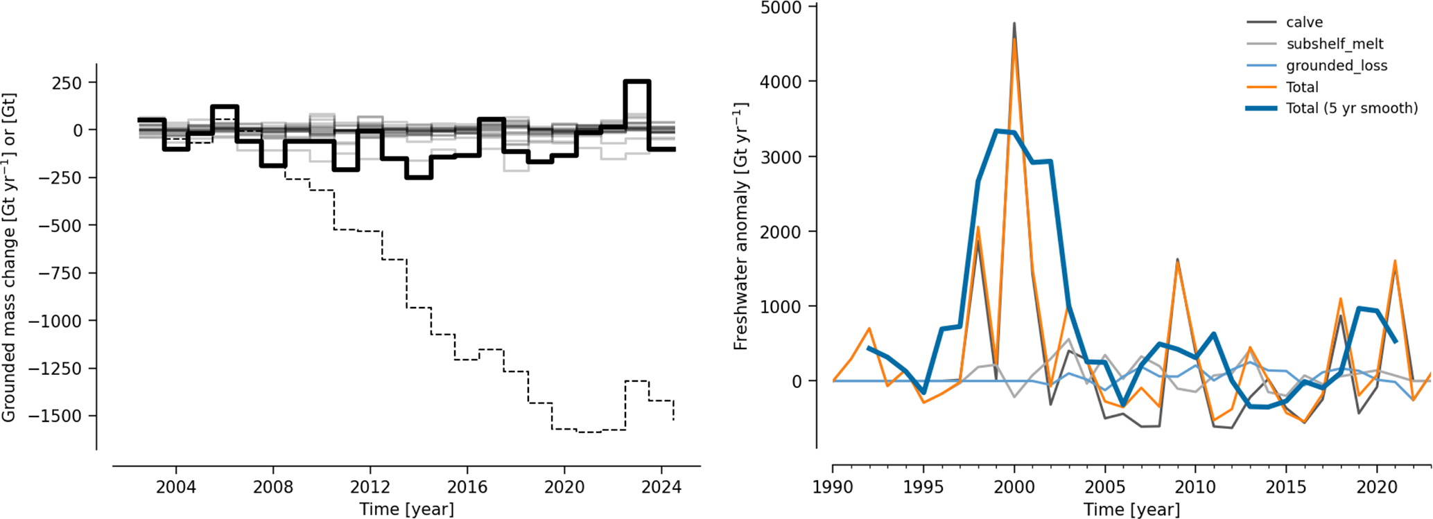 Figure 8Antarctica grounded mass change (left) and freshwater anomaly (right). Left: Light gray lines are the 18 regions (Fig. 2). Thick black line is sum of all regions, and dashed line is cumulative sum. Right: Components contributing to freshwater anomaly without lag applied to calving. We recommend spreading Antarctic calving over 10 years as iceberg melt is not instantaneous. Product provided as part of this work available at https://doi.org/10.5281/zenodo.14020895 (Mankoff et al., 2025a).