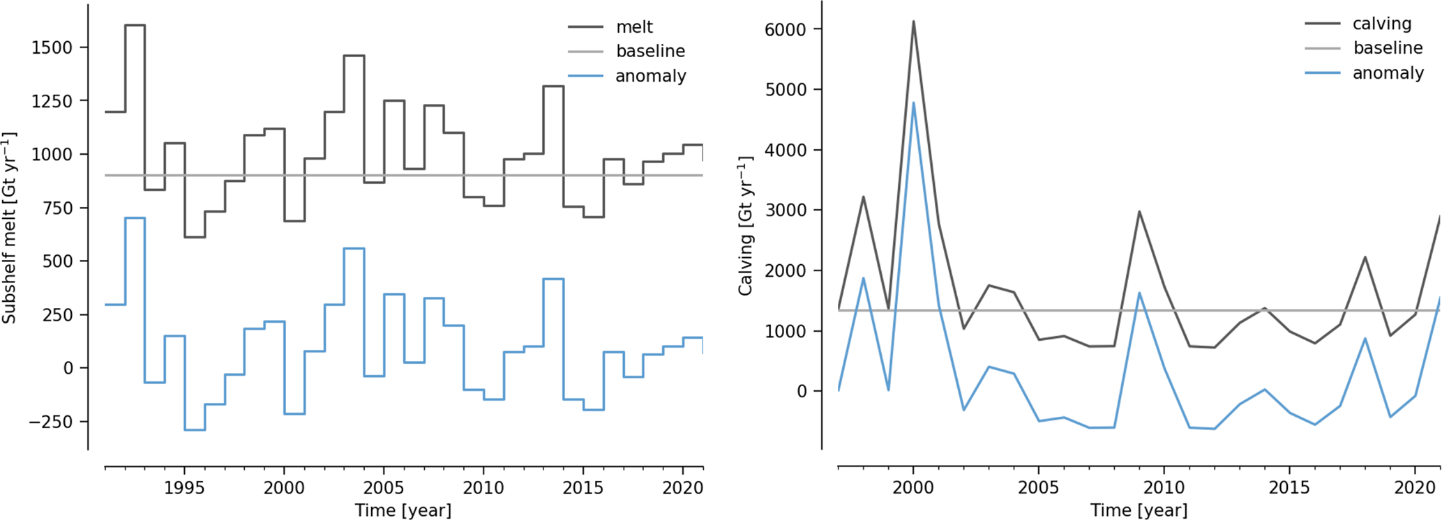 Figure 9Antarctica sub-shelf melt and calving mass flow rates, baseline, and anomalies. We recommend spreading Antarctic calving over 10 years as iceberg melt is not instantaneous. Product provided as part of this work available at https://doi.org/10.5281/zenodo.14020895 (Mankoff et al., 2025a).