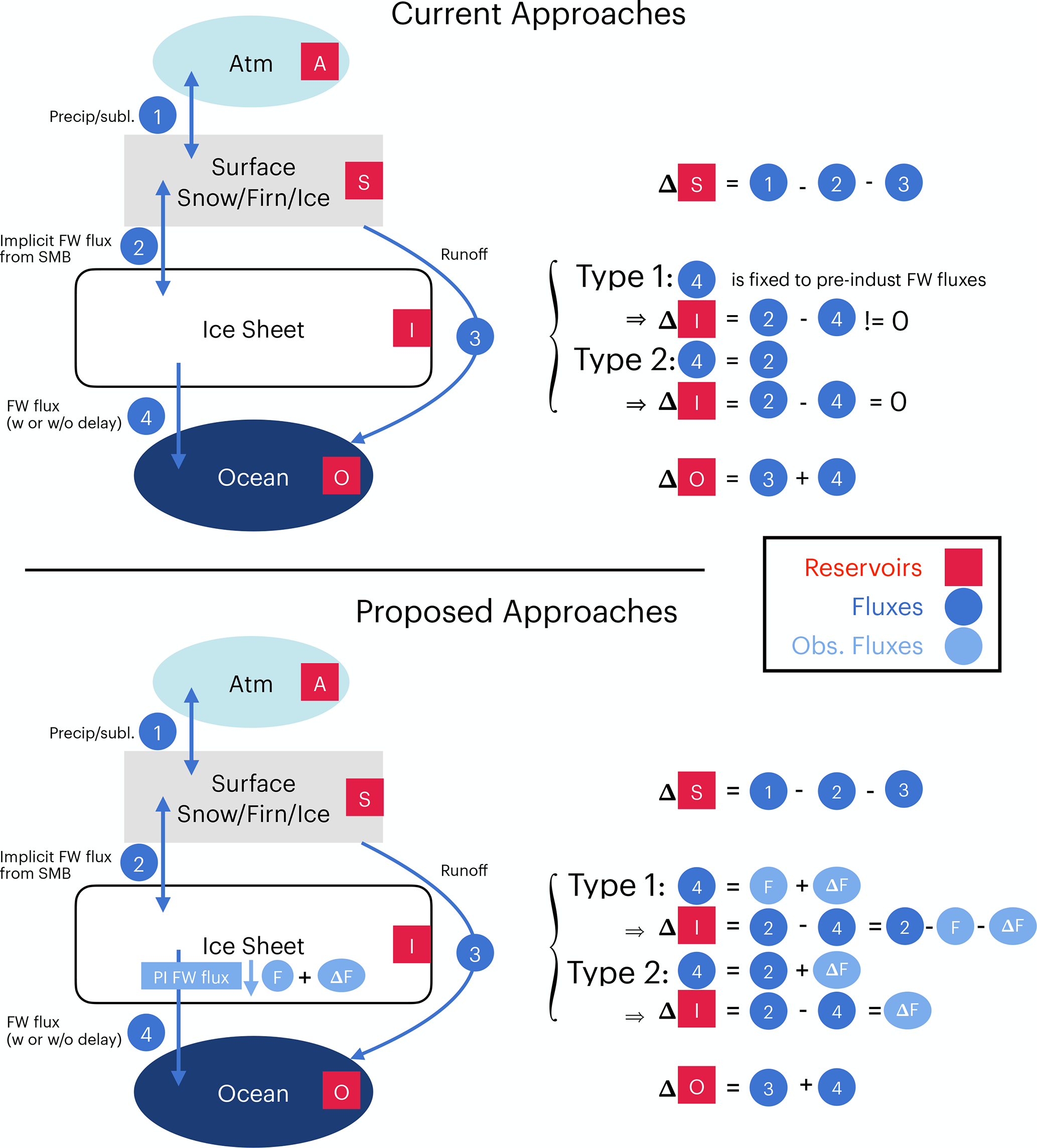 Recently, efforts to use the historical record of changing freshwater (FW) (Slater et al., 2021) supported suggestions that the magnitude of the observed FW is potentially a first order impact on regional oceanographic conditions (Schmidt et al., 2023). This evidence strongly indicates that modeling groups need to move towards coupled earth system models and ice sheet models (ESM-ISMs) for ocean circulation, stratification and sea level purposes. However, this has been more challenging than was anticipated two decades ago (Little et al., 2007; Nowicki et al., 2016). Some groups have successfully demonstrated such capability in some model versions (e.g., Barbi et al., 2014; Muntjewerf et al., 2021; Smith et al., 2021; Siahaan et al., 2022; Goelzer et al., 2025), some of which will be used in CMIP7, but it is likely that most CMIP7 model simulations will not include this functionality.