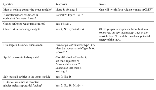 Specifically, many groups surveyed force any snow amount above a certain depth on the ice sheet to be converted to ice and (implicitly) added to the ice sheet (e.g., Kelley et al., 2020; Swart et al., 2019; Bi et al., 2020). Similarly, in ablating areas there is an implicit loss of ice. The total effect for the current climate is a net positive SMB, and therefore there is a need to add this mass back into the ocean as icebergs. There is an associated implicit energy flow (associated with the latent and sensible heat of the snow) and tracer flow (depending on composition) which also need to be balanced to allow for an equilibrium to emerge.