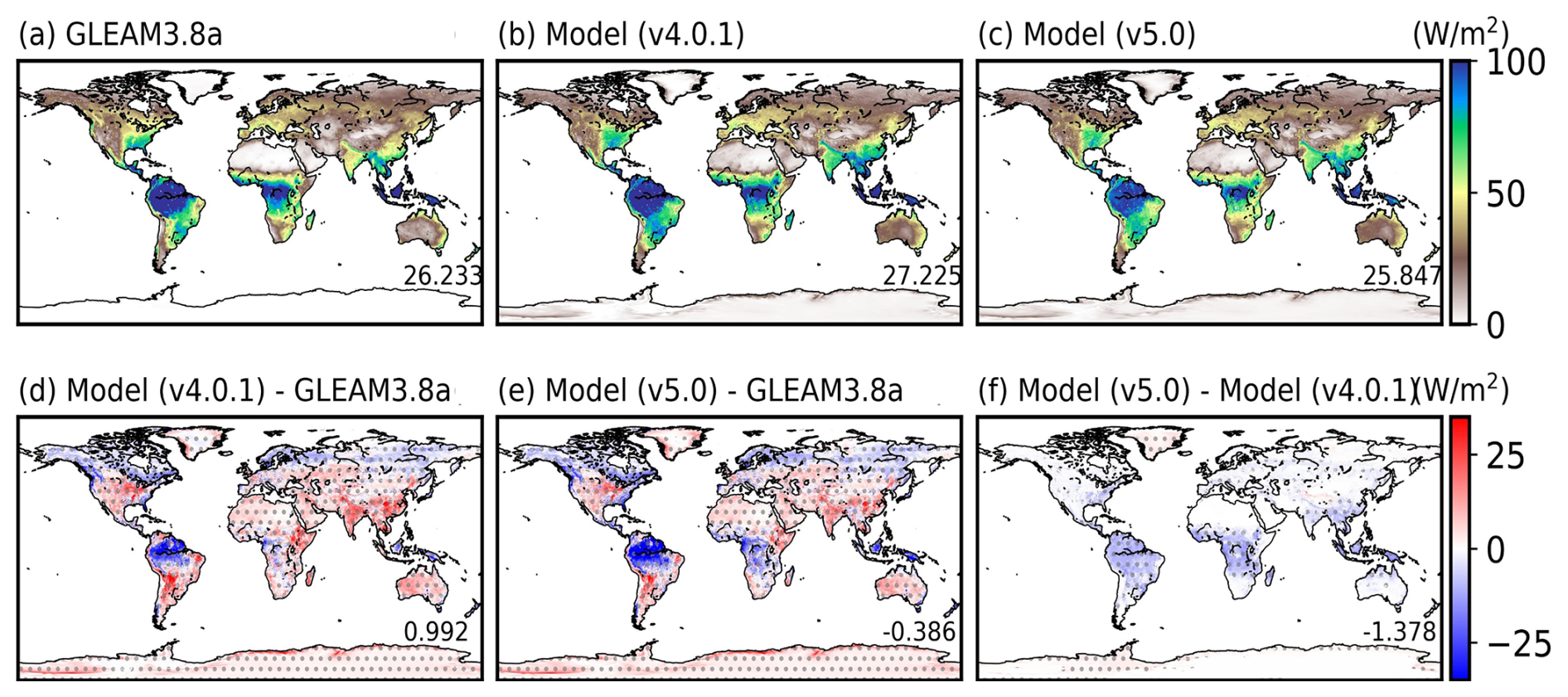 Figure 8 shows the global 5-year (2018–2022) mean latent heat (LH) flux comparison between the GLEAM data and LIS/Noah-MP simulations driven by the USAF forcing. Both LIS/Noah-MPv4.0.1 and LIS/Noah-MPv5.0 simulations capture the spatial and seasonal LH distributions with similar bias patterns (Figs. 8 and S3). The model LH biases are generally consistent with the surface soil moisture bias patterns (Fig. 2), with the underestimated (overestimated) LH over regions with the underestimated (overestimated) soil moisture, except for northern Eurasia and northwest North America (Alaska and west Canada). Although LIS/Noah-MPv5.0 has a slightly higher soil moisture than LIS/Noah-MPv4.0.1 (Figs. 2–4), it shows a lower LH (by up to  15 W m−2) over some tropical and mid-latitude regions with the largest difference in the tropics, which reduces the global mean LH bias from 0.99 W m−2 (LIS/Noah-MPv4.0.1) to 0.39 W m−2 (LIS/Noah-MPv5.0). This difference in the two Noah-MP versions is mainly due to the code updates related to vegetation properties (e.g., bug fixes in vegetation fraction scaling treatments) and processes (e.g., added canopy heat storage treatment) which alters ET and LH (see Sect. 5 for discussion). The minor LH difference (up to  5 W m−2) between the two model versions over the Antarctica and Greenland is mainly caused by updates in the glacier scheme that uses snowpack physics consistent with other land snowpacks in LIS/Noah-MPv5.0. We note that the LH (or ET) reference data product also has nontrivial uncertainties which may confound model evaluations here (see Sect. 5 for detail).