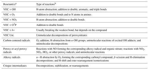 Table 1 lists the types of stable compounds whose reactions can be generated and shows the types of initial atmospheric reactions that can be generated for them. Table 2 lists the types of reactions that are generated, including reactions of intermediate radicals as well as reactions of stable compounds. The reactions of stable compounds include H-atom abstractions by OH, NO3, and Cl radicals, additions to double bonds by these radicals and by O3 and O3P, and reactions by photolysis. The types of radicals generated include carbon-centered radicals that in most cases react primarily with O2; peroxy radicals that in most cases react with NO, NO2, NO3, HO2, or other peroxy radicals and in many cases also have unimolecular reactions; alkoxy radicals that can react with O2 or by various types of unimolecular reactions; and excited and stabilized Criegee intermediates formed in reactions of alkenes with O3. Measured rate constants or branching ratios derived from measured product yields are used when data are available. In the absence of such data, which is typically the case, rate constants or branching ratios are estimated using various structure-activity relationships (SARs) or other estimation methods. The details of the types of reactions and how rate constants or branching ratios are assigned or estimated are given by Carter et al. (2025a).