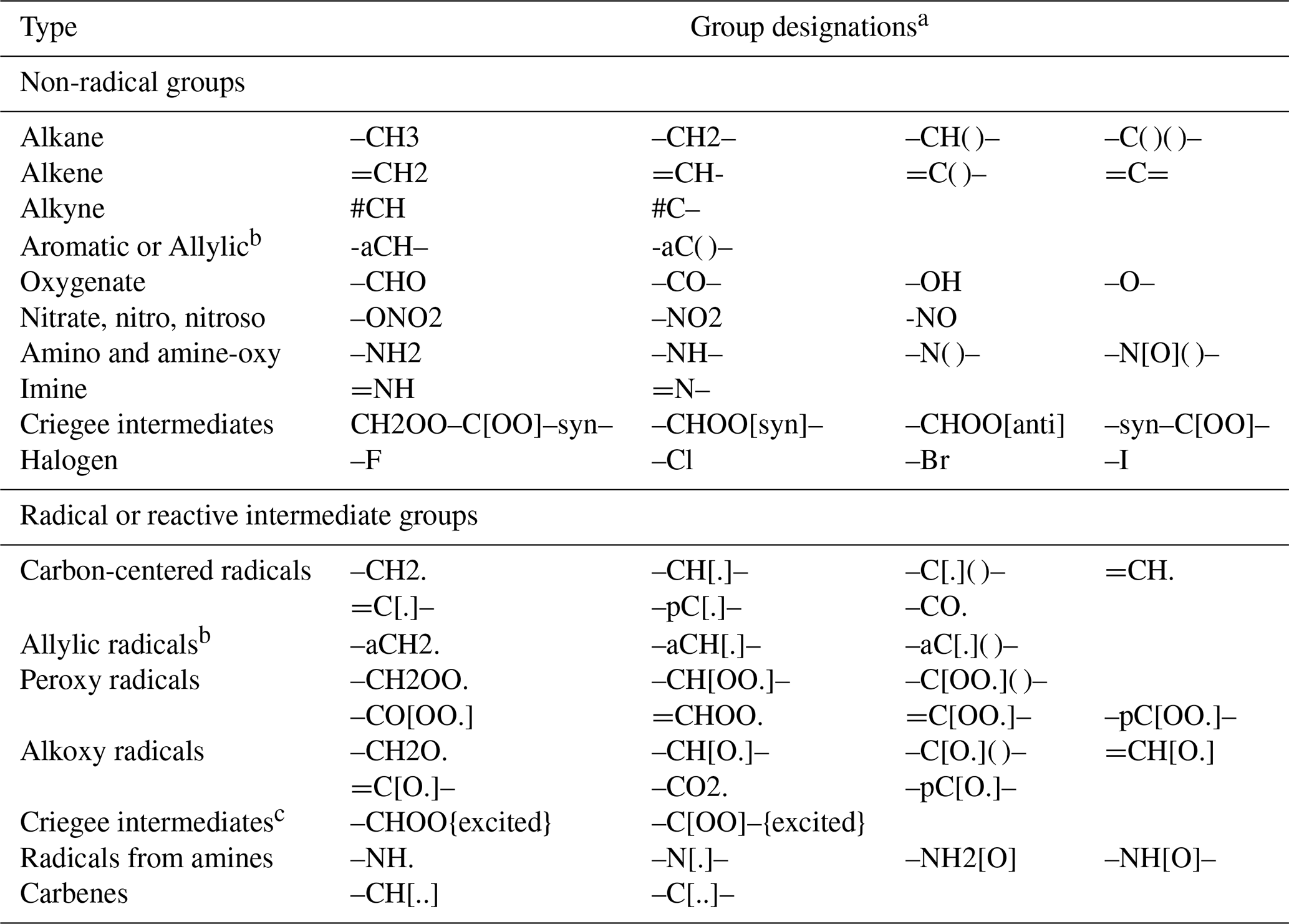 a Bond types are indicated by “-” (single or aromatic), “=” (double), or “#” (triple). The number of bonds shown indicates if it is bonded to one or two or more groups. The “()” notation is not part of the group designation itself but is used to indicate that the group is bonded to a third or fourth group. An “a” or “p” prefix in the group name indicates that it has alternating single and double bonds. The “p” prefix is used for phenyl, phenoxy, or phenyl peroxy radicals. Some groups can have different bond designations depending on their location in the molecule, e.g., “CH3-” or “-C[.]=” rather than “-CH3” and “=C[.]-”. See examples in Table 4. bAllylic groups are used in reactants with two or more resonance structures involving adjacent double bonds and radical centers. Allylic radical groups are used for the portions where that the radical center is located in at least some of the resonance structures. Aromatic groups are used for the portions where the radical center is not located in any resonance structures. c The “{excited}” designation is given at the end of the structure designation and indicates how the excited intermediate was formed. This designation is also used following full reactant structure designations to indicate excited adducts formed when radicals add to double bonds, but in this case the excitation is associated with the entire molecule and not a single group.