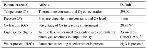 a Affects output displays and estimates of product yields but not reactions in explicit generated mechanisms. However, this affects the full mechanism generation process discussed in Sect. 3. b The actinic fluxes are used to calculate rates of photolysis reactions given the absorption cross sections and quantum yields assigned to the photolysis reactions. The photolysis frequencies are not part of the mechanism but are included as outputs of single-step mechanism generation and are also used to derive overall product yields for various environments, as discussed in Sect. 3.3, and to derive multi-generation mechanisms, as discussed in Sect. 4. c Currently applicable only to low-reactivity Criegee intermediates (Carter et al., 2025a).