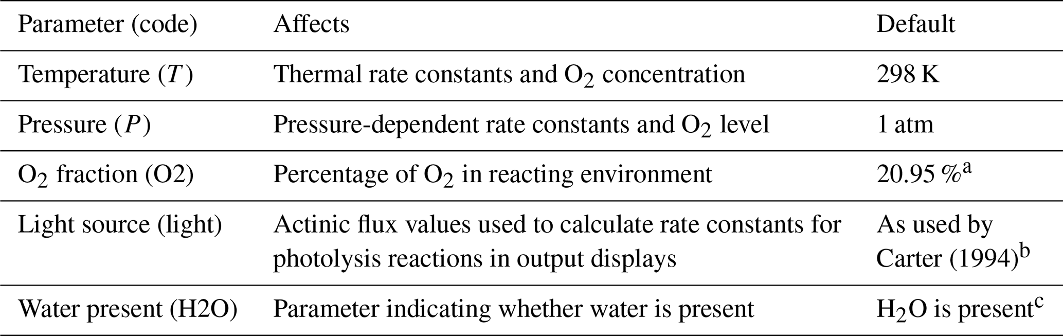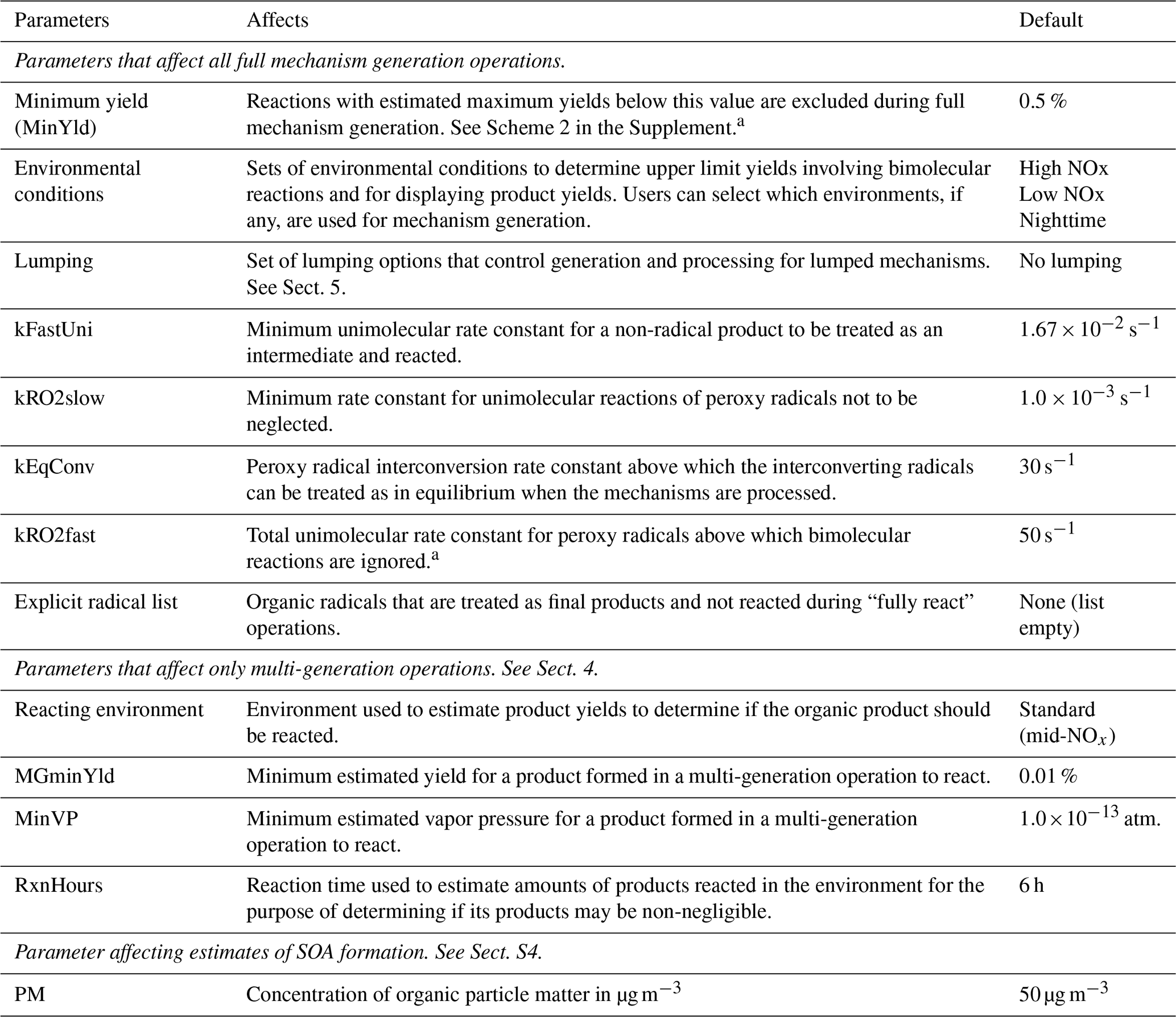 The user-modifiable parameters that affect the single-step reaction generation process are shown in Table 6. The temperature affects the thermal rate constants. The pressure affects rate constants assigned to falloff reactions and estimated nitrate yields in the reactions of peroxy radicals with NO and, in some cases, fractions of excited radicals that are stabilized. The presence of water affects estimated reactions of low- reactivity, stabilized Criegee intermediates, as indicated in Fig. 1 (Carter et al., 2025a). When users select single-step operations, all estimated reactions are displayed, allowing users to see which reactions are considered and how their rate constants are estimated. However, negligible reactions are removed when the outputs of single-step reaction operations are processed when called during full mechanism generation, as discussed in Sect. 3. In addition, reactions of non-acyl peroxy radicals with NO2 forming alkyl peroxynitrates (shown in Fig. S1c) are not included during full mechanism generation by default because these peroxynitrates are assumed to rapidly decompose at temperatures of interest (Carter et al., 2025a). These reactions can be included by either increasing the kFastUni parameter (see Table 8) or decreasing the reactor temperature such that the estimated rate constant is less than kFastUni.