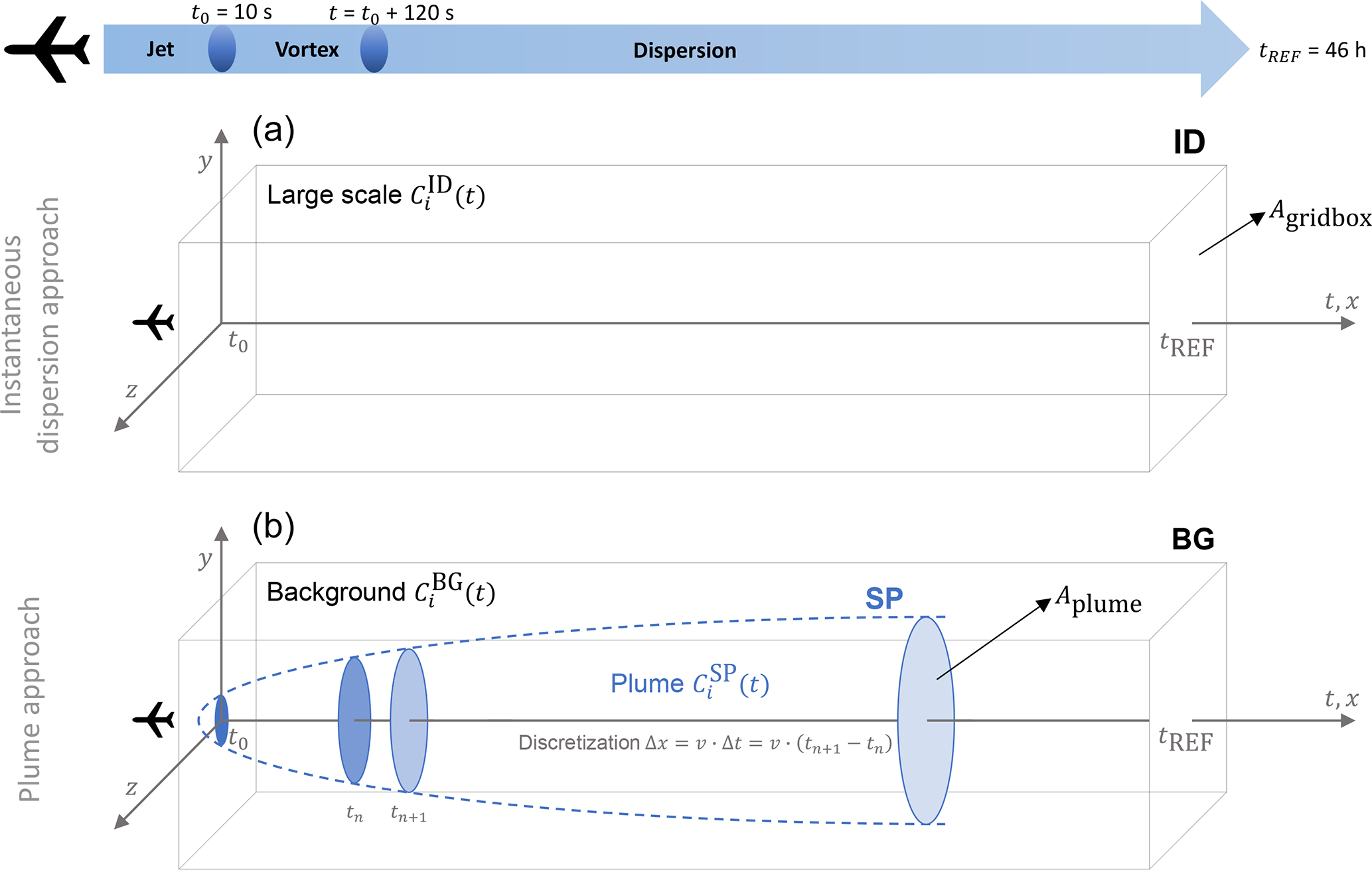 Figure 1Schematic representation of an aircraft exhaust plume inside the background shown by the double-box model highlighting the two approaches adopted in this study: (a) instantaneous dispersion approach of aircraft emissions in a large-scale grid-box (ID box); (b) plume approach accounting for the dispersion of a single aircraft plume (SP box) in the background (BG box). The x-axis represents the flight trajectory. The plume gradually grows and disperses with time t, both vertically (y-axis) and laterally (z-axis). The plume growth is schematically represented by the elliptical cross-section area Aplume increasing at each timestep behind the aircraft, while the cross-section area Agridbox of the large-scale remains constant. Here, t0 denotes the initial timestep of the simulation, set at the end of the jet regime (∼ 10 s behind the aircraft, not accounted for in the model), whereas , and indicate the concentration of a species i in the three boxes, respectively. The arrow on the top symbolizes an aircraft exhaust plume with different regimes based on their time of emission.