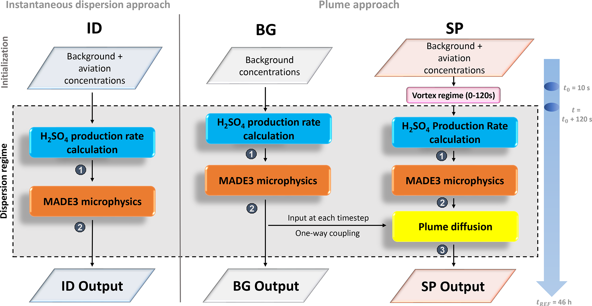 The details of the time integration within each box are shown in Fig. 2. At each model timestep, the chemical production rate of H2SO4 is calculated before calling the MADE3 microphysical scheme, which integrates the aerosol mass and number concentrations by solving the aerosol dynamics equations (see Sect. 2.2.3). The explicit calculation of the H2SO4 production rate during the model time integration is an improvement introduced in this work compared to the MADE3 box-model version by Kaiser et al. (2014), who assumed a prescribed constant production rate of H2SO4. Here, we opted for a more sophisticated approach, where the production rate is calculated at each timestep from the SO2 and OH concentrations (see details in Sect. 2.2.1). The online sulfate production rate calculation is relevant in the context of this study, as the H2SO4 production rate affects the nucleation of sulfate particles and the growth of existing particles by condensation, hence having an impact on the aerosol properties, in particular on the number concentration. The SP box includes two further processes, that are specific to the plume approach: the diffusion routine accounting for the mixing of the plume with the entrained background (Sect. 2.2.3) and the routine for the vortex regime, which simulates the coagulation of the aerosol particles with the ice particles during the vortex regime (upto 2 min behind the aircraft), representing the aerosol-ice interactions occurring within a short-lived contrail in a simplified manner (Sect. 2.2.4). We will show that this is a key process in the plume evolution and has a substantial impact on the resulting aviation-induced particle number concentration. The time integration of the dispersion regime is the same in all boxes and considers a constant time-step of 60 s, while the short vortex regime of the SP box uses a time resolution of 1 s, given the short duration (2 min) of this regime. The meteorological parameters temperature, pressure and relative humidity are kept constant during the whole simulation and are identical in the three boxes. The generated output comprises of temporally resolved aerosol mass and number concentrations for all simulated species.
