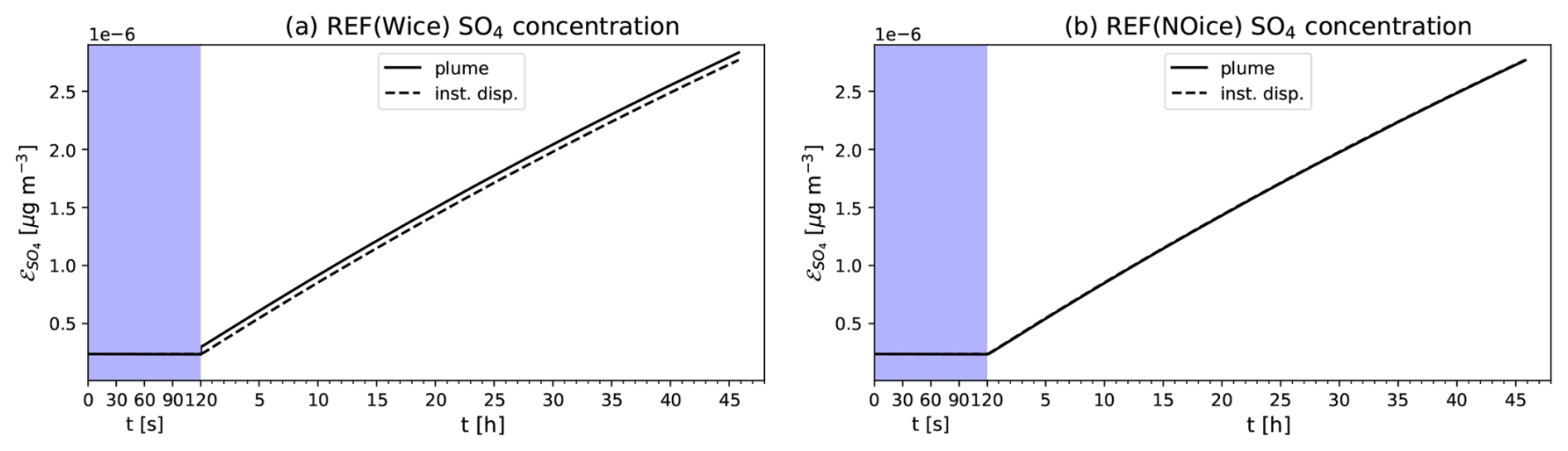 Figure 4Aviation effect (ℰ) on the concentration of SO4 in the two modelling approaches: plume (solid) and instantaneous dispersion (dashed) in the reference case with (a) and without (b) the short-lived contrail ice. The shaded area represent the vortex regime. Note the different units for time on the horizontal axis for the vortex and dispersion regime.