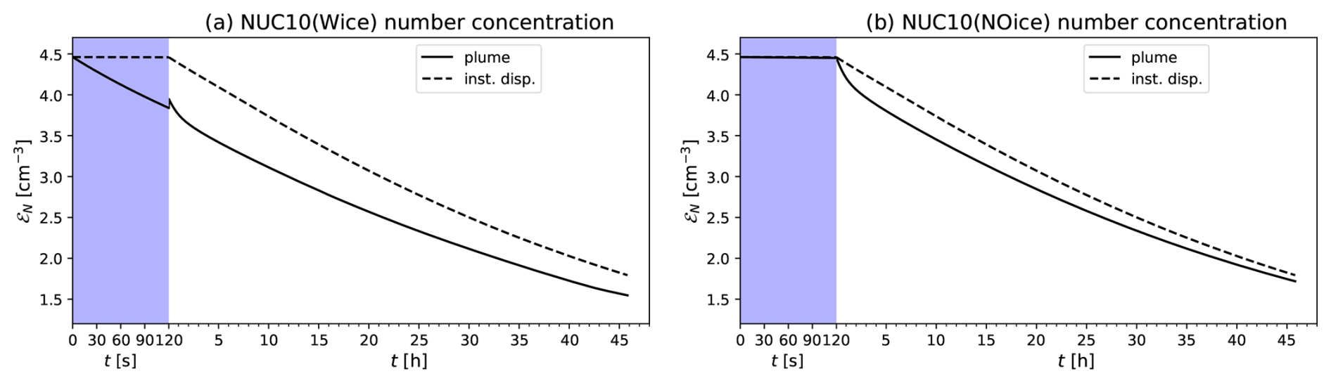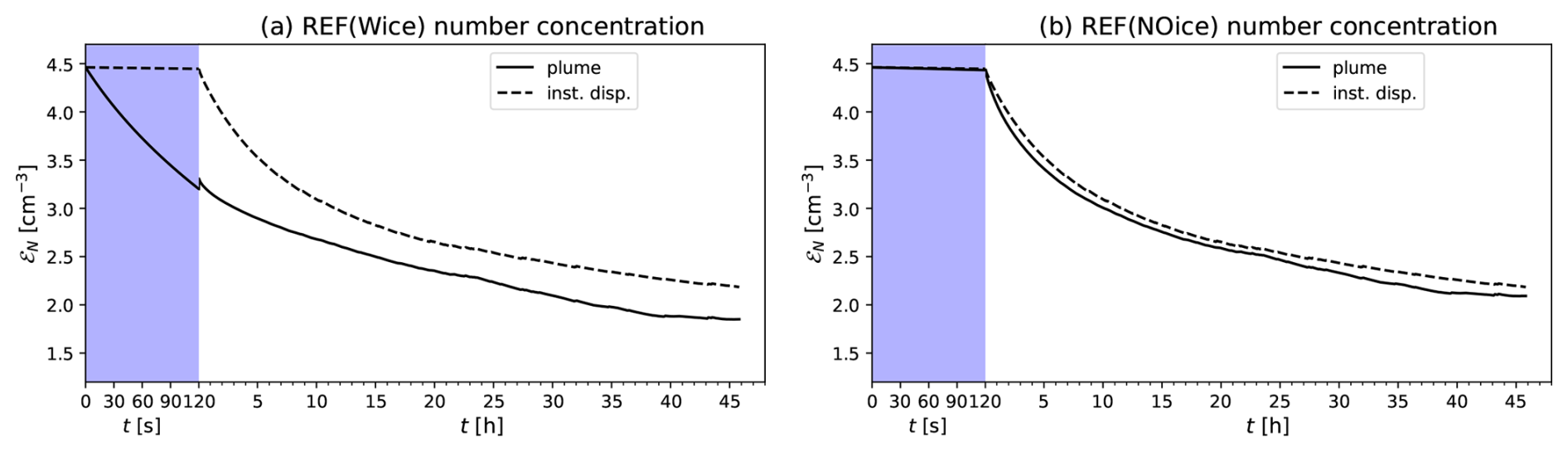 These results demonstrate the overestimation of the aviation-induced aerosol number concentration by the instantaneous dispersion approach adopted by the global models as they have important implications for the calculation of the climate effect of aviation aerosol on low-clouds. Moreover, the comparison of the plume correction 𝒫 at the reference time between the two scenarios REF(Wice) and REF(NOice) highlights the importance of representing contrail ice in the vortex regime and their substantial impact on the aviation-induced particle number concentration, with 𝒫(tref) increasing from −4.2 % in the REF(NOice) scenario to −15 % in the REF(Wice) scenario considering the impact of short-lived contrail ice. For future application of the plume model to correct for the subgrid scale processes in global models, it is important to note that plume correction is relevant not only at the reference time, but also at earlier stages of the plume evolution.