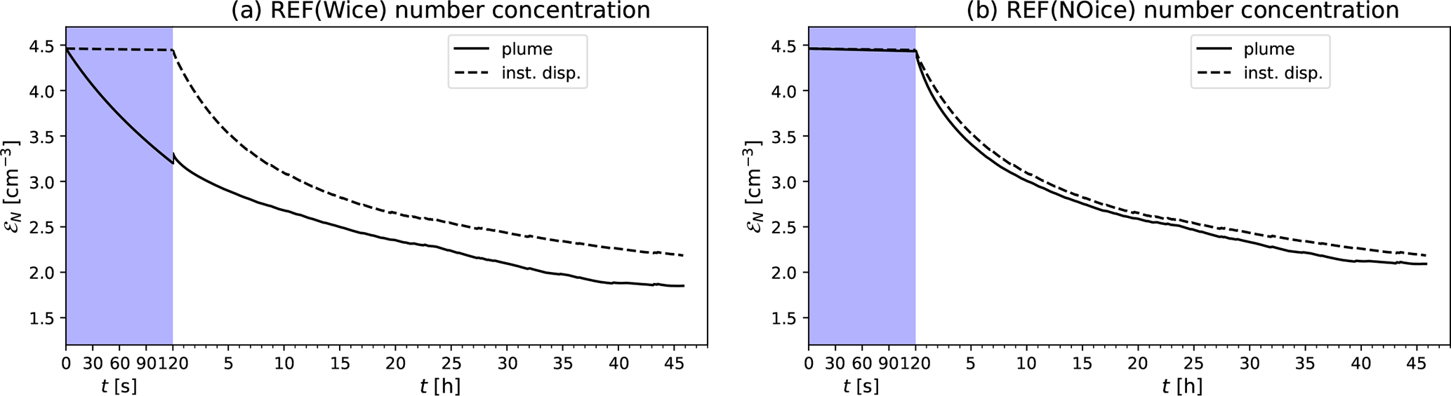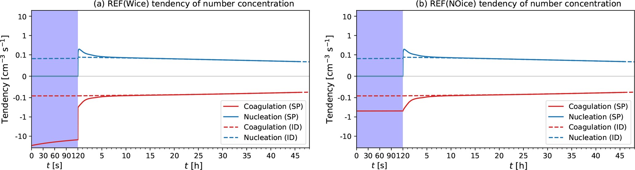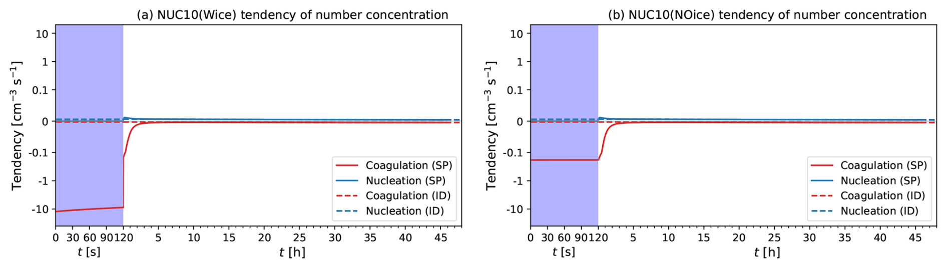 A similar analysis is performed for the aviation-induced aerosol number concentrations to isolate the effect of microphysical processes from the plume dispersion (Fig. 5). Here, a clear difference between the plume and the instantaneous dispersion approach can be distinguished, in both scenarios. In the REF(Wice) scenario, the aviation-induced number concentration is considerably reduced during the vortex regime: due to their much larger size (∼ 1 µm), the ice crystals effectively remove the Aitken-sized (< 10 nm) aerosol particles via coagulation within the first 2 min of the simulation. After contrail sublimation at the end of the vortex regime, the residual aerosol numbers are then returned to the aerosol phase (assuming one residual particle is left for each ice crystal), which can be seen as the slight increase in number concentration at t=120 s in Fig. 5a (solid line). During the dispersion regime, the number concentration is further reduced in both approaches, due to the coagulation process, which is more efficient in the plume approach. At the same time, nucleation events occur during the dispersion regime, contributing to increase the number by forming new sulfate particles from the gas phase. Given the small size of the particles assumed by the nucleation scheme of MADE3 (Vehkamäki et al., 2002), even a few nucleation events might have large contributions to the particle number. Hence, the two processes act in opposite directions to affect particle number concentrations. The analysis of the respective tendencies (Fig. 6) shows that both processes are more efficient in the SP than in the ID box due to the higher concentrations, especially in the early phase of the plume dispersion (first 8 h), while they evolve similarly at later stages.
