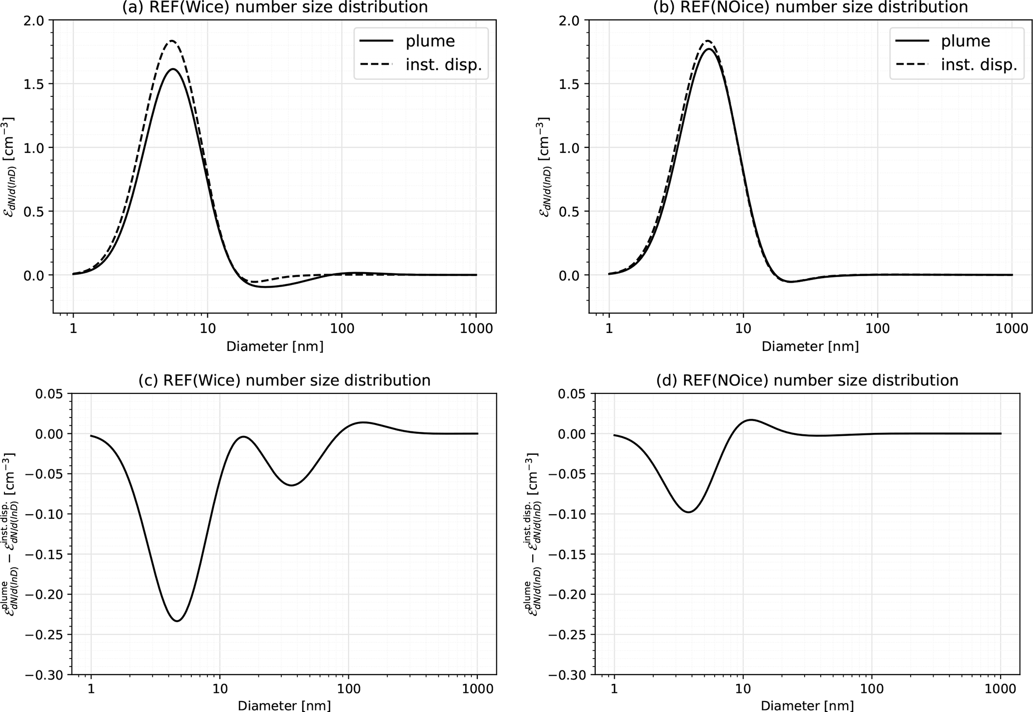 Figure 7Aviation effect ℰ at the reference time on the lognormal size distribution calculated from aerosol number concentrations and dry diameters at the reference time in the two approaches (plume and instantaneous dispersion) and for the two scenarios REF(Wice) (a) and REF(NOice) (b). Panels (c) and (d) show the difference between the aviation effects in the two approaches.