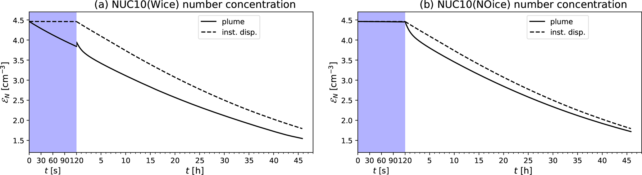 This section explores the plume model output in terms of aviation-induced aerosol number concentrations and lognormal size distributions at the end of the dispersion regime, from both model approaches: plume and instantaneous dispersion for the reference setup (REF; Sect. 3.1) and a sensitivity on the representation of the nucleation process (NUC10; Sect. 3.2). All experiments are conducted under two plume scenarios, i.e. with and without the presence of contrail ice particles in the vortex regime (indicated as Wice and NOice, respectively). For the reference setup, we consider typical background conditions of the North Atlantic region (Table 1) to initialise the plume model. The North Atlantic airspace is considered as one of the world's busiest aviation corridors, making it a prime region for studying the impact of aviation emissions on the climate (Lee et al., 2009). In Sect. 3.3 other regions are explored to understand the impact of background conditions on the plume model results. The sensitivity of the plume results to the initial parameters for aircraft emissions (see Table 2) is investigated by means of dedicated parametric studies (Sect. 3.4). Furthermore, we also analyse the impact of different microphysical processes (such as coagulation, condensation and nucleation) in all experiments based on the tendency diagnostics. An overview of all experiments conducted in this work is provided in Table 4.