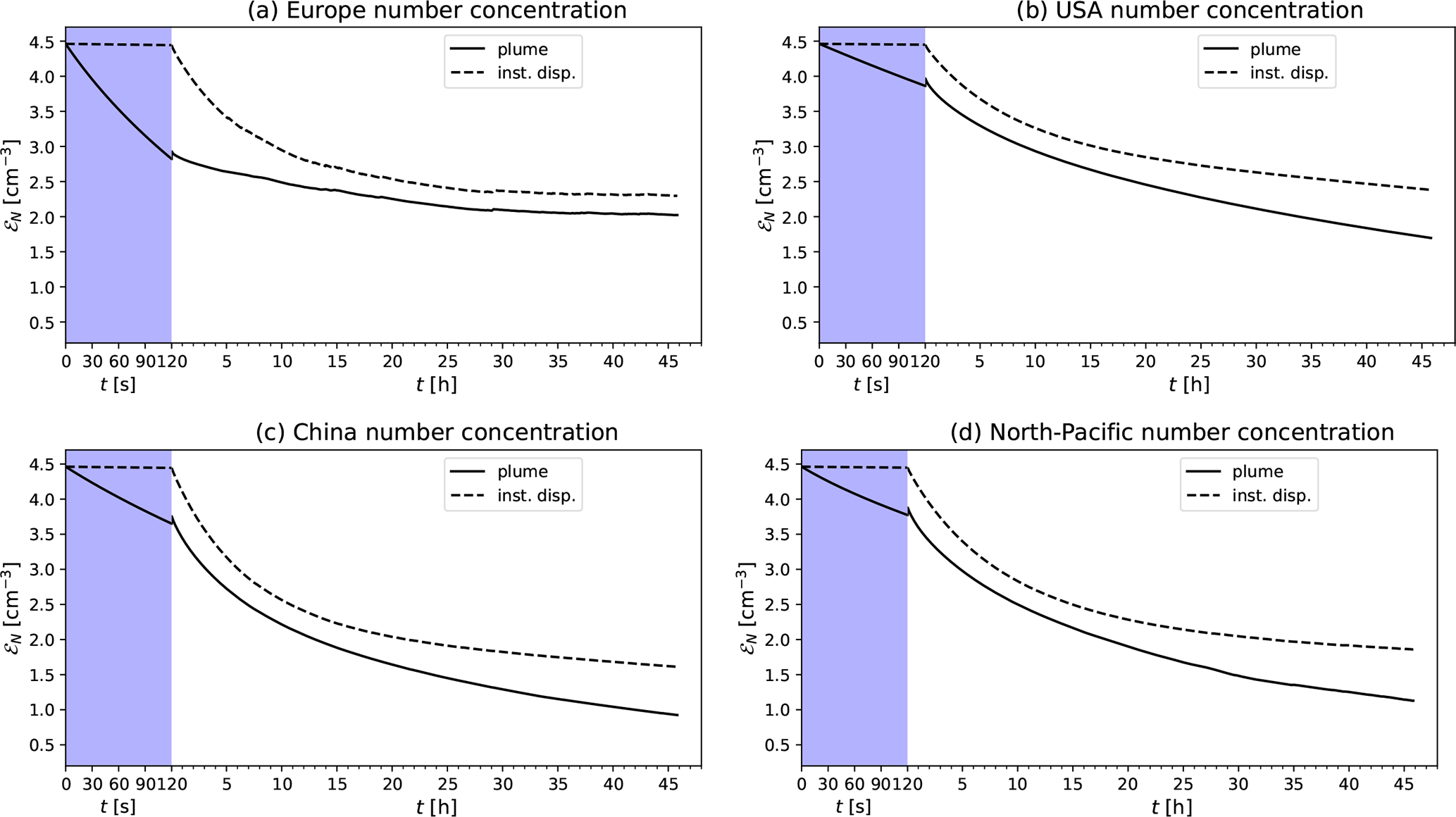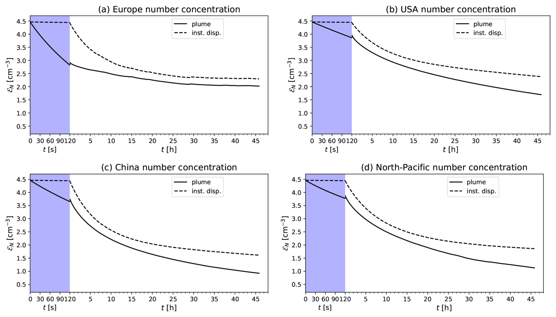The previous sections showed an example of the application of the plume model for typical conditions over the North Atlantic, but these conditions may of course vary over other regions. This is especially important when considering background concentrations and the way they influence the aerosol microphysical processes in the plume. Nucleation events, for instance, are favoured in cleaner backgrounds, due to the lower availability of aerosol particles serving as condensation sinks. Given the key importance of the nucleation processes for the plume correction demonstrated above, it is important to analyse the plume results in different regions. Here, we consider four regions in the Northern Hemisphere, characterized by different background properties than the North Atlantic: Europe, USA, China and North Pacific (see Table 1 for details). The plume model simulations are performed using the same parameters of the REF case under the Wice scenario. Only the initial background concentrations are varied.