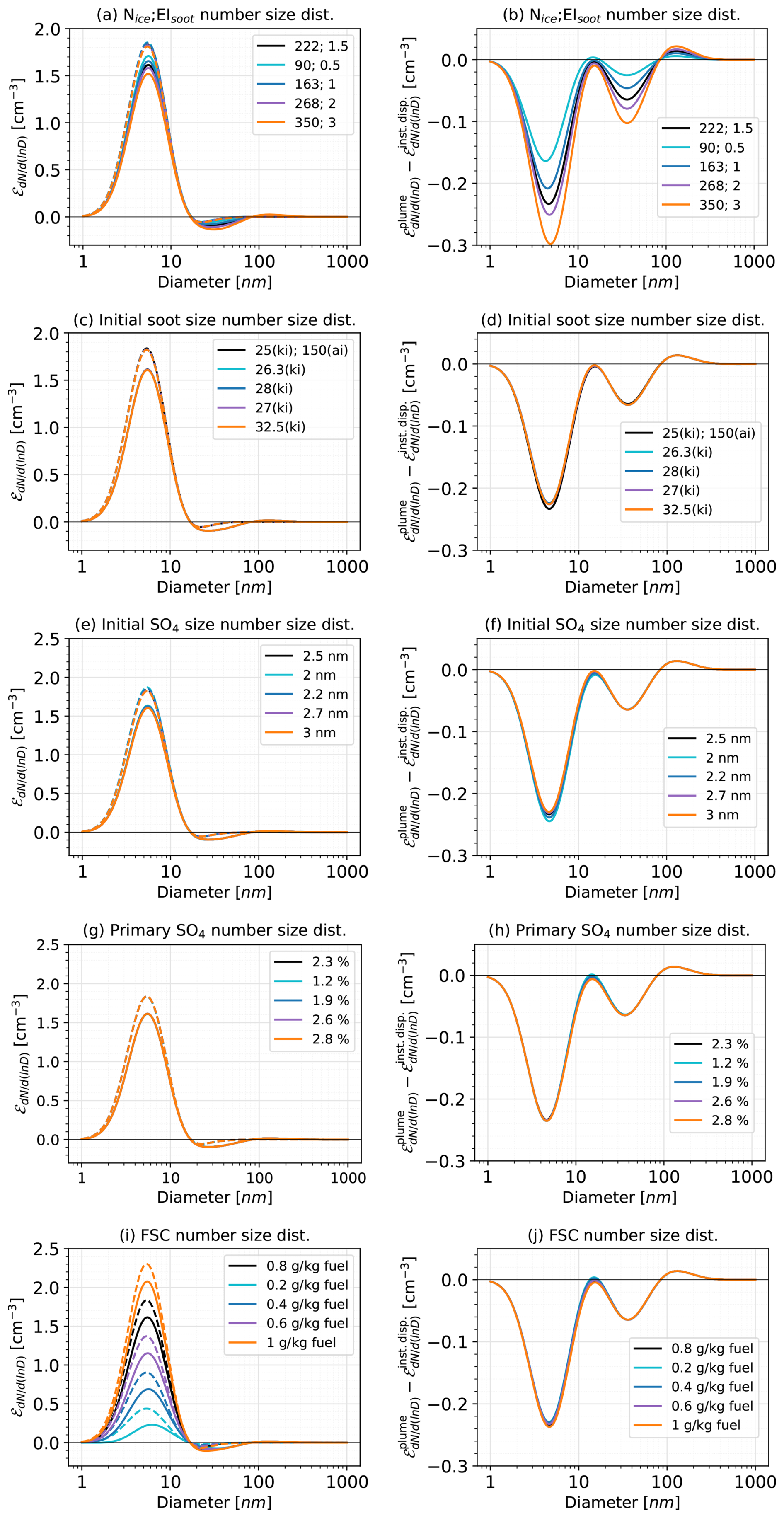 Parametric studies on several aviation emission parameters used for model initialization show a strong sensitivity of the plume correction to the assumed ice crystal number concentration in the scenario with a contrail in the vortex regime (controlling the efficiency of the nucleation with aerosol particles and thus their number reduction) and to the fuel sulfur content (impacting the SO2 emission and consequently, the formation of H2SO4, eventually leading to new particle formation via nucleation). Despite the dominant importance of aviation-induced sulfate particles over soot particles, the model shows a weak sensitivity to sulfate-related parameters, such as the amount and size of the primary SO4 particle fraction.