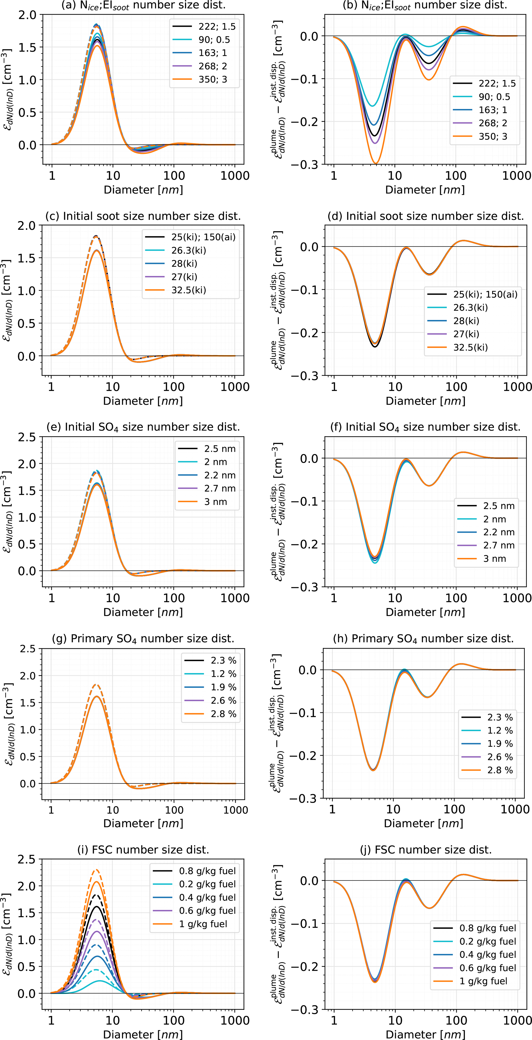 The aviation effect on the number concentration (Fig. 8) shows the same temporal evolution as in the REF case (Fig. 5): a very strong reduction in the vortex regime in the REF(Wice) scenario and a monotonic decrease during the dispersion phase. This decrease is much smoother than in the REF case, since the nucleation events in NUC10 contributes a factor of fewer particles due to the increase in their assumed size. Furthermore, as a result of the different initialization of the background, a lower number of particles is entrained in the NUC10 case, hence also the reduction during the vortex regime is relatively lower than in REF case. Nevertheless, the plume correction at the reference time is comparable to the REF case, about −13 % [−77; 55] % (−0.24 [−1.45; 0.95] cm−3) and −4.2 % [−9.1; 1.2] % (−0.07 [−0.17; 0.02] cm−3), in the NUC10(Wice) and NUC10(NOice) scenarios. The plume correction values in NUC10 scenarios are close to those of the REF case, but are characterized by a much larger variability, particularly in the Wice case. The tendency analysis (Fig. 9) shows an overall reduction in the efficiency of both microphysical processes in the NUC10 case as compared to the REF case. The aviation effect on the size distribution at the reference time peaks at a larger size of 10–15 nm for both scenarios compared to the REF case that peaks at 5–6 nm (Figs. S2a, b and 7a, b). This is due to the increased size of newly nucleated particle, which corresponds to the particles with relatively larger size (∼ 20 nm) surviving towards the end of the dispersion regime. The maximum of the distribution in the instantaneous dispersion approach remains higher than in the plume approach for both scenarios (with and without ice), especially for the particles around 10–20 nm size, which are mostly SO4 particles. The difference between the aviation effects in two approaches for the size distribution (Fig. S2c,d) further shows that the instantaneous dispersion approach overestimates the survival of the Aitken mode particles between at 8–10 nm and underestimates the 20 nm particles, which results from the less efficient coagulation process in the instantaneous dispersion approach as compared to the plume approach (Fig. 9).