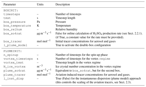 Table 3List of the namelist parameters for the box-model configuration (BOXINIT) and double-box aircraft exhaust plume model configuration (PLUMEINIT). For simplicity, only the parameters which are relevant to this study are listed, for a complete listing see Kaiser et al. (2014).