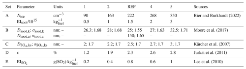 Bier and Burkhardt (2022)Moore et al. (2017)Kärcher et al. (2007)Jurkat et al. (2011)Lee et al. (2010)Table 5List of parameters shortlisted for the parametric study. Each set of variations of a given parameter is identified by an index (A–E) and the different values of the parameters by a number (1–4) in addition to the reference (REF).
