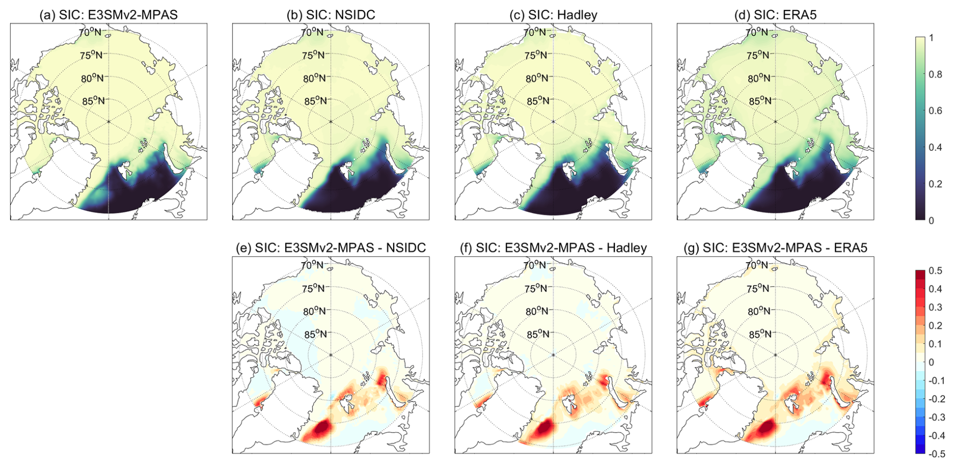 Figure 3During winter (December–February), (a–d) 1995–2020 climatological mean SIC spatial distributions: (a) E3SMv2-MPAS simulations, (b) NSIDC observational product, (c) Hadley Centre HadISST data, (d) ERA5 reanalysis. (e–g) SIC bias fields: (e) E3SMv2-MPAS vs. NSIDC, (f) E3SMv2-MPAS vs. Hadley, (g) E3SMv2-MPAS vs. ERA5.