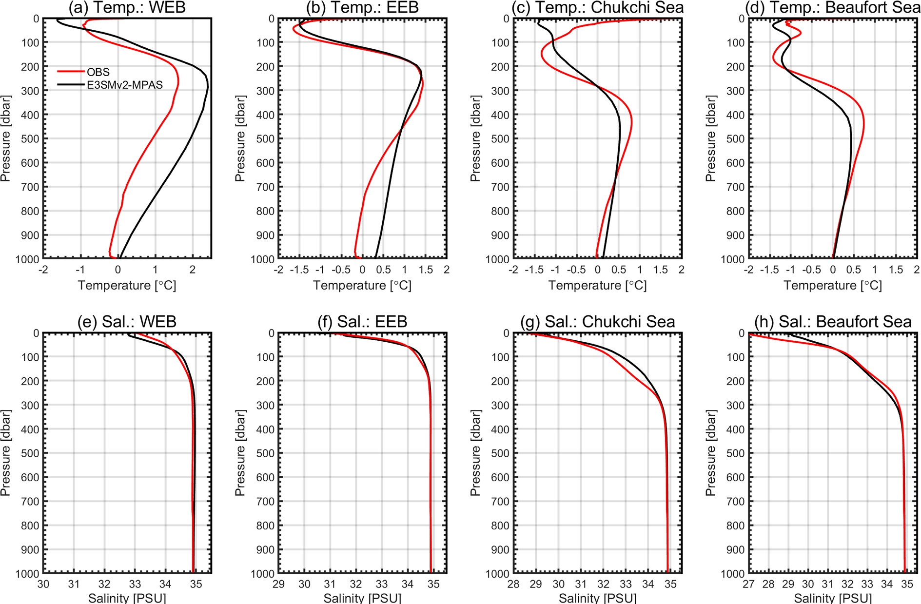 Using the 1995–2014 climatological mean profiles, systematic comparisons are conducted between E3SMv2-MPAS and observational data (Muilwijk et al., 2023) across four regions: the western Eurasian Basin, the eastern Eurasian Basin, the Chukchi Sea, and the Beaufort Sea. Thermohaline profile characteristics (0–1000 m depth) are evaluated through vertical structure evolution and regional variability analyses.