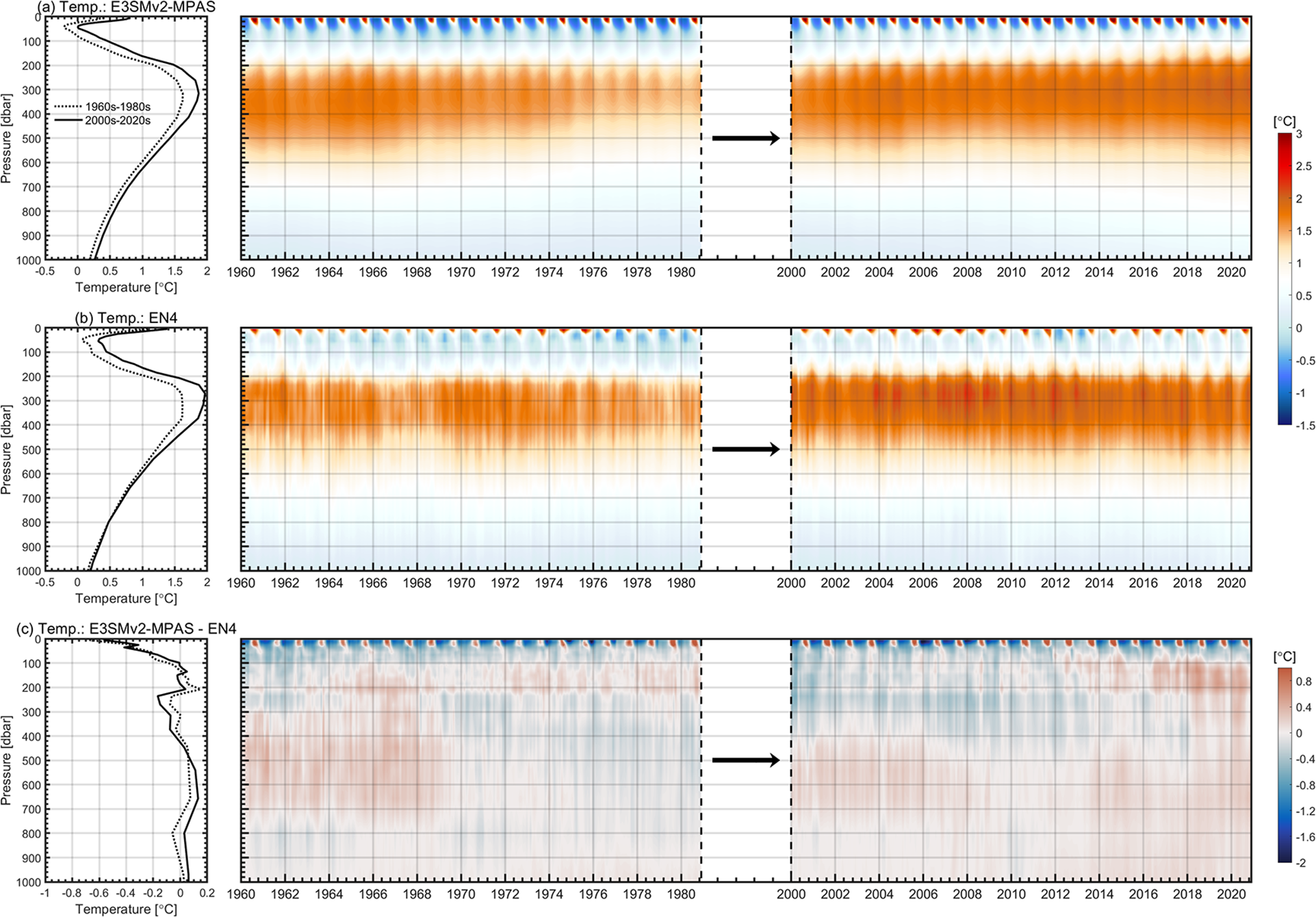 Figure 11For the Arctic Basin, (a) E3SMv2-MPAS simulated temperature profiles (0–1000 m): 1960–1980 climatology (dashed) vs. 2000–2020 climatology (solid). Right: Hovmöller diagram of depth-time evolution (1960–1980 and 2000–2020). (b) The same as panel (a) but for EN.4.2.2. (c) The same as panel (a) but for E3SMv2-MPAS minus EN.4.2.2 differences.