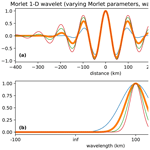 The Morlet wavelet is shown in Fig. 1 in both spatial and frequency space. The scale is chosen for each wavelet to have the same period in its oscillation of 100 km: under these conditions, k widens the Gaussian envelope allowing more periods of the oscillation to fit under it. This directly affects the spectral localization; i.e. more repetitions under the envelope imply a higher spectral resolution and vice versa. The smaller k, the larger becomes, i.e. the “less” admissible it becomes in its unmodified form. Commonly used values are 6 or 2π. The default value for JuWavelet is 2π as this simplifies the interpretation of results; e.g. the scale parameter s is identical to the analysed wave period for the default value.
