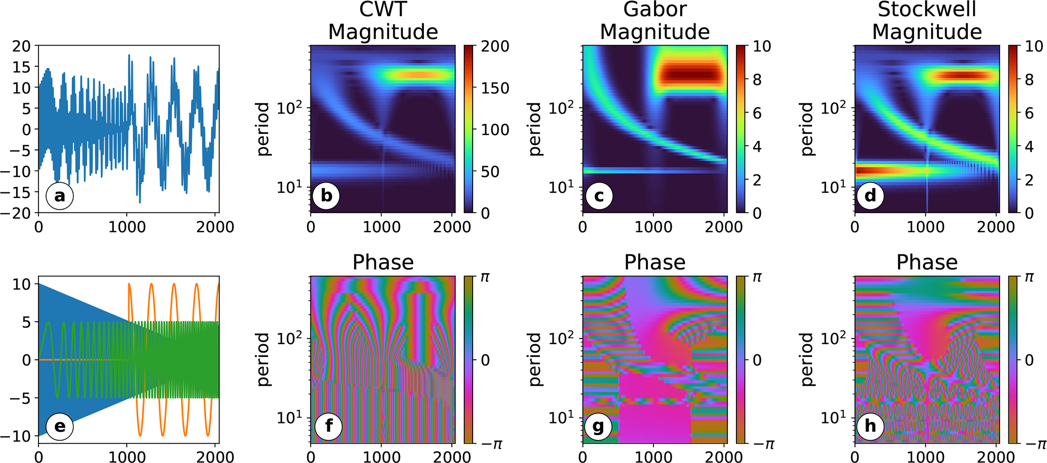 Figure 2An analysis of a combination of three signals, which each vary in a different quantity (amplitude, frequency, location). Panel (a) shows the assembled signal, while panel (e) shows the individual signals. Panel (b) and (f) show the magnitude and the phase of the CWT coefficients. Panel (c) and (g) show the magnitude and phase of the Gabor STFT coefficients. Panels (d) and (h) show the magnitude and phase of the ST coefficients.