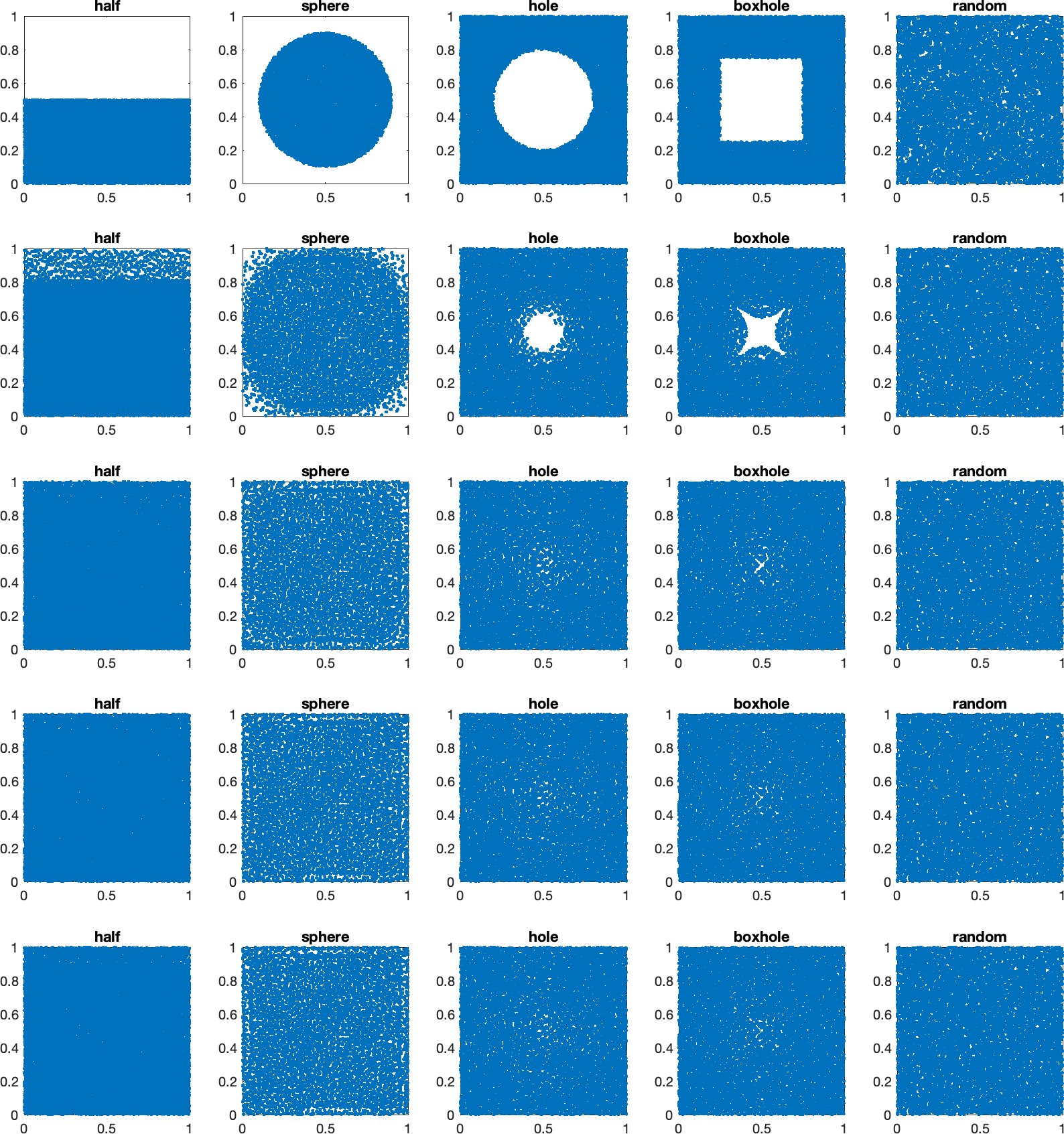 Figure 2Tracer positions in the five highly nonuniform tests performed in 2-D with 32×32 cells and 10 tracers per cell on average. Each column is one test case and each blue dot is a tracer. Shown are (top row) the initial condition and (rows 2–5) nudges 1–4.