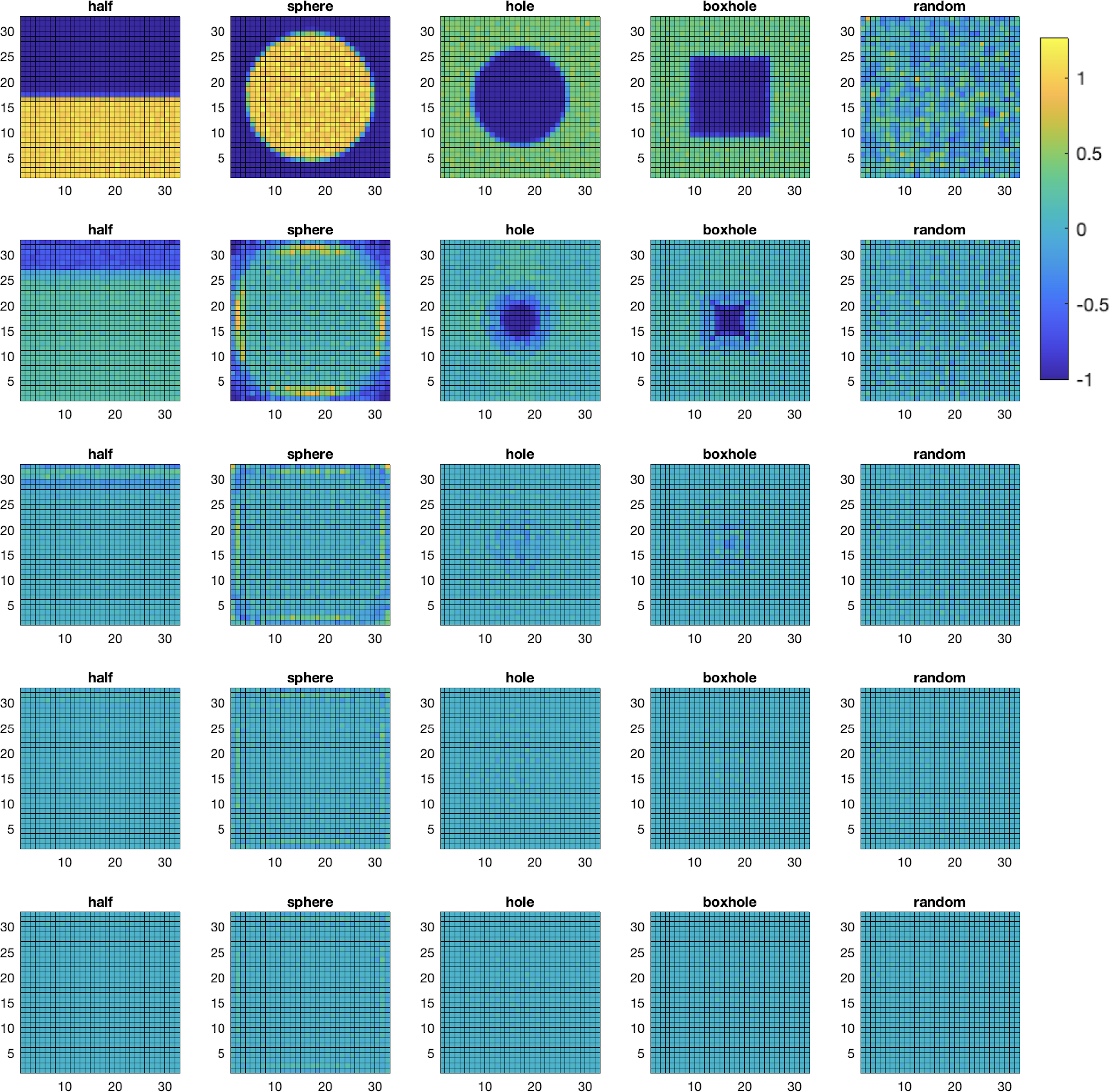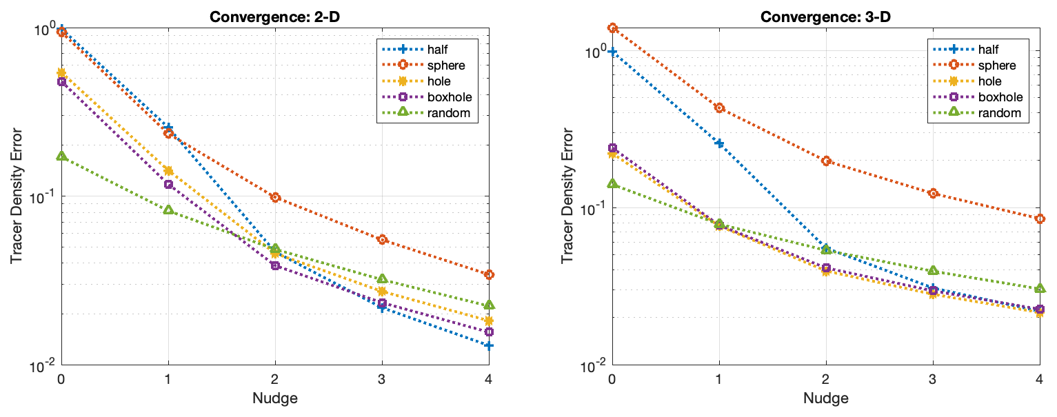 Figure 4 shows how the L1 norm of tracer density error decreases with number of nudges for the 2-D tests (Figs. 2 and 3) and for 3-D versions of the tests. For highly non-uniform initial conditions the reduction in tracer density error is more than an order of magnitude after 2 nudges, then becomes less rapid. Again, the random initial condition has substantial tracer density error approaching 0.2. 3-D cases are similar but with slightly slower convergence for the “sphere” case.