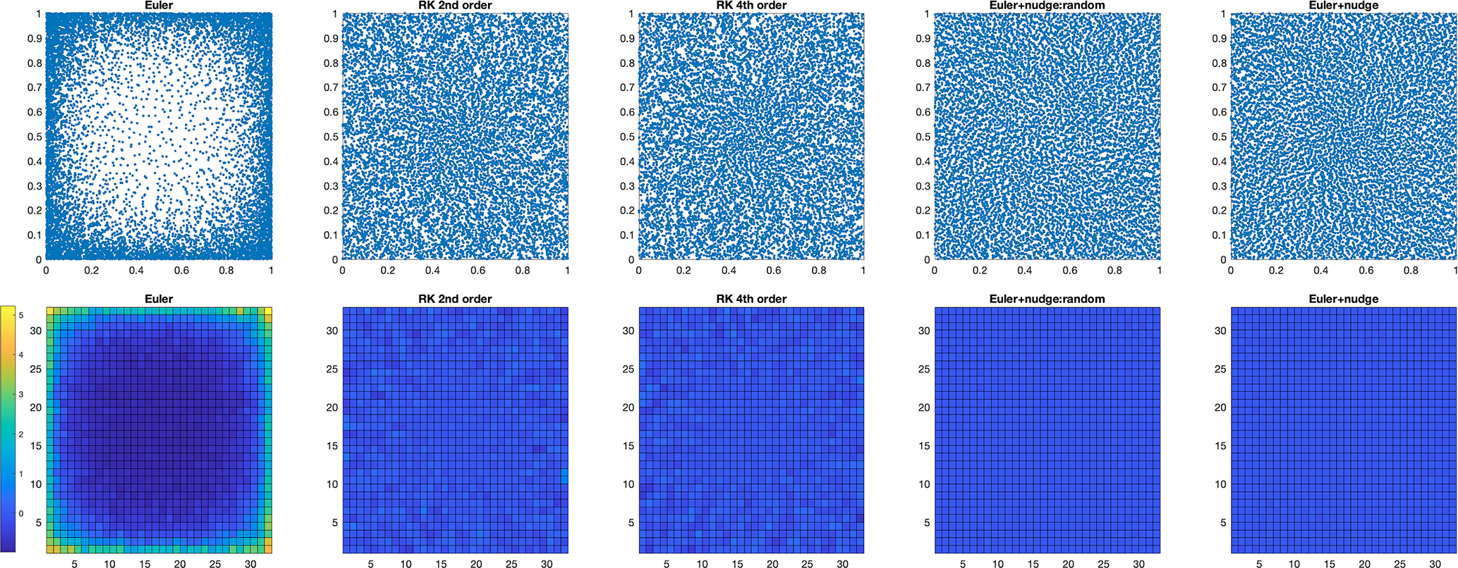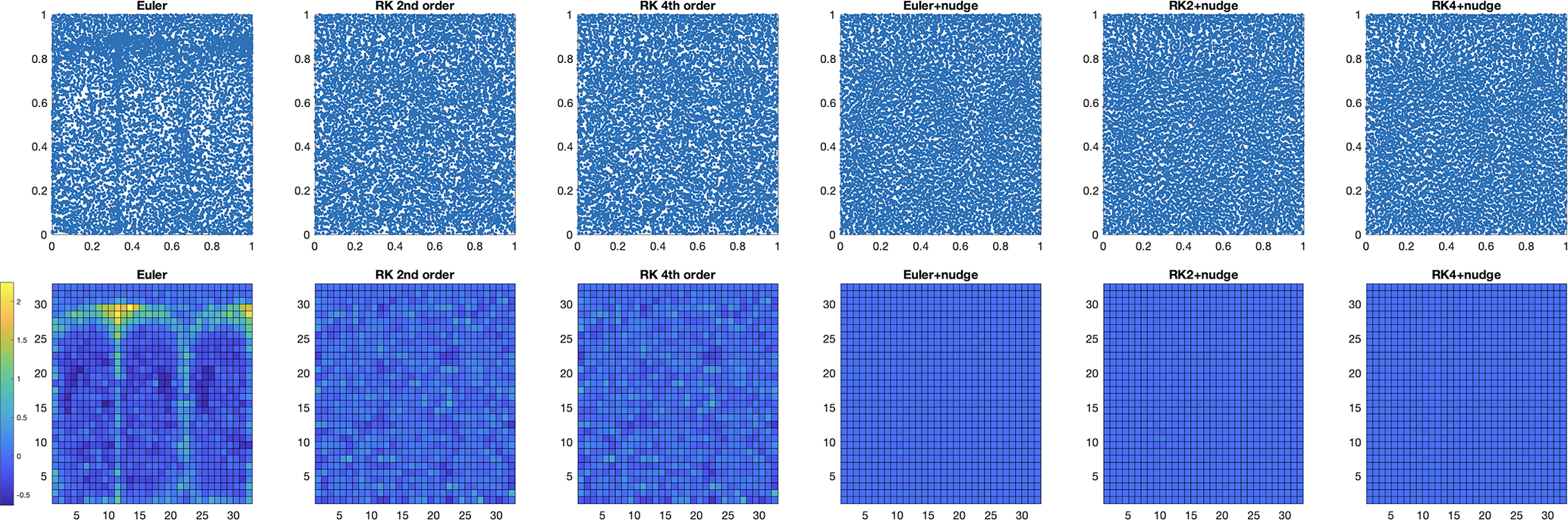 Figure 5 shows tracer distributions and density error fields after 100 time-steps of nondimensional time 0.05 on a 32×32 grid with an average of 10 tracers per cell. As the maximum velocity given by Eq. (12) is 1, tracers move a maximum distance of 0.05 in one step. As expected, the Euler method (1st column) is quite inaccurate, with tracers spiraling outwards and building up towards the domain boundaries and corners. With the addition of a single nudge per step (right two columns), however, the tracer distribution remains even and negligible tracer density error is visible. The 2nd- and 4th-order Runge-Kutta methods produce similar results to each other, with significant unevenness visible in the tracer density error field.