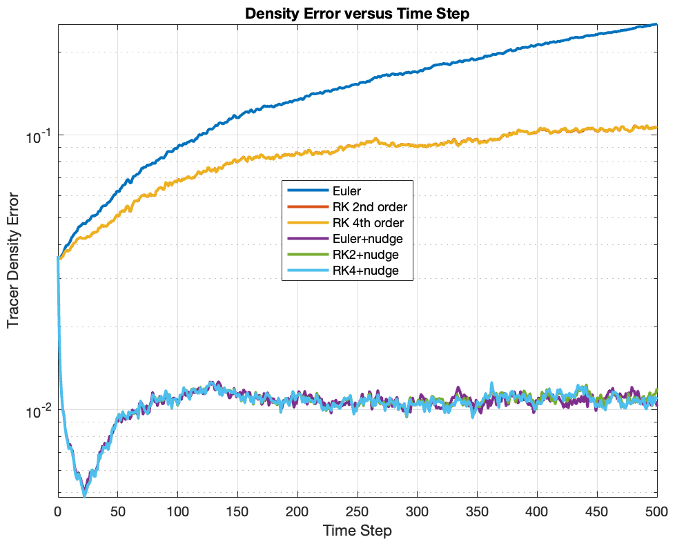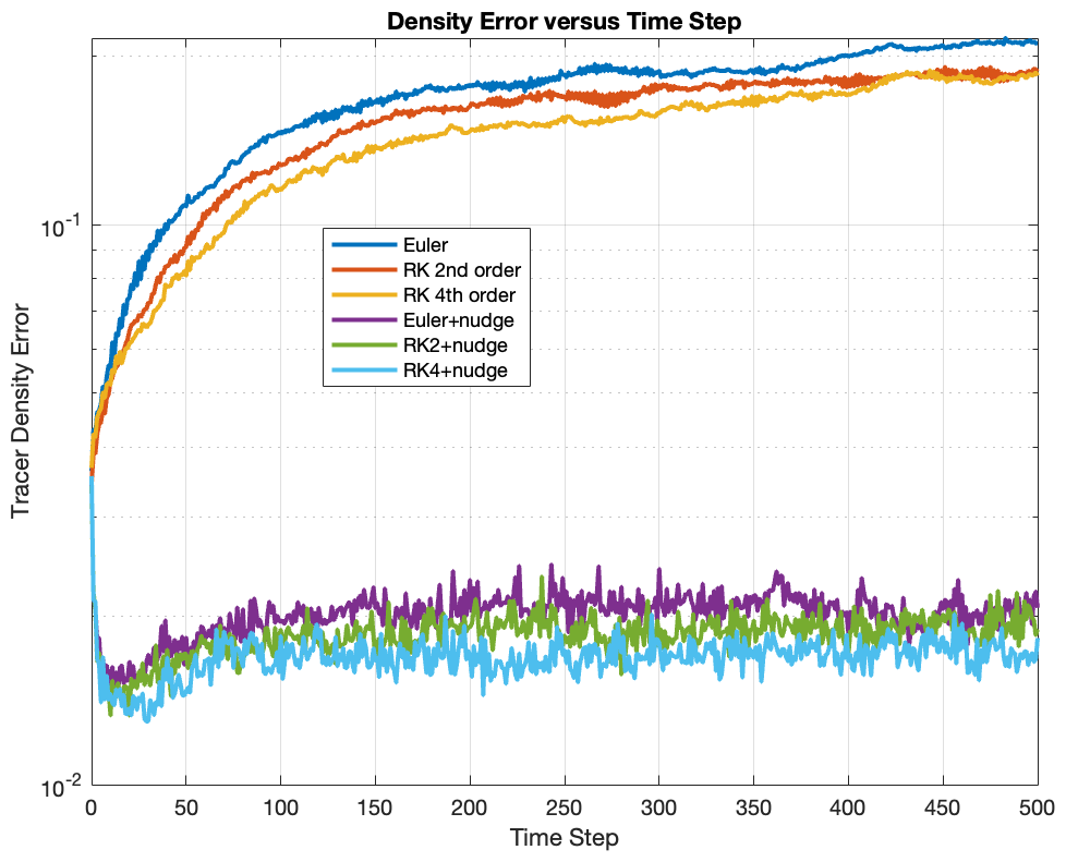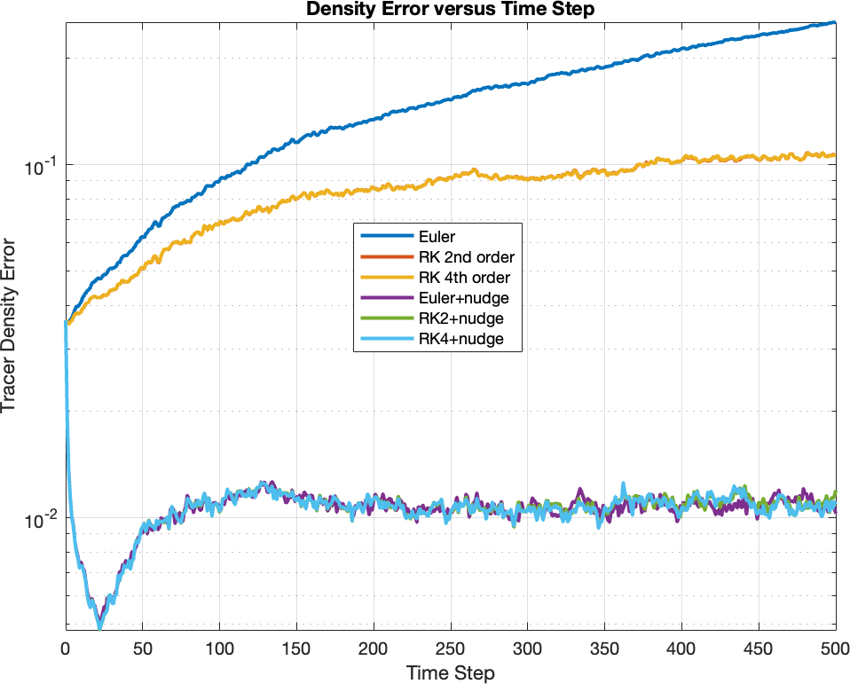 The time-evolution of tracer density error is quantified in Fig. 6, which shows the L1-norm versus time step. The “Euler” case rapidly develops a large density error, whereas in both Runge-Kutta cases the error increases steadily from the initial condition, surprisingly at a similar rate for the 2nd- and 4th-order schemes. Adding a single nudge per step to Euler advection causes a reduction of density error to a low value, which is subsequently maintained. A completely random initial condition has a density error of  a factor of 4 higher than (even + random), indicating that the latter initial condition is much better. Even so, adding a nudge correction per step rapidly reduces the error.