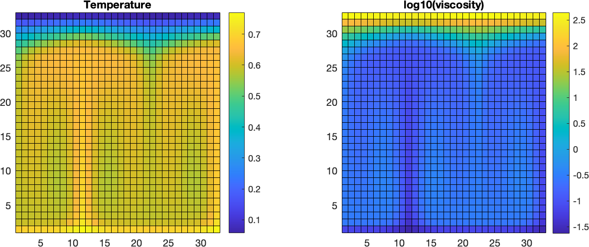Figure 9Non-dimensional temperature and viscosity fields for the thermal convection test after 500 time steps. They are the same regardless of tracer advection method because tracers are purely passive.