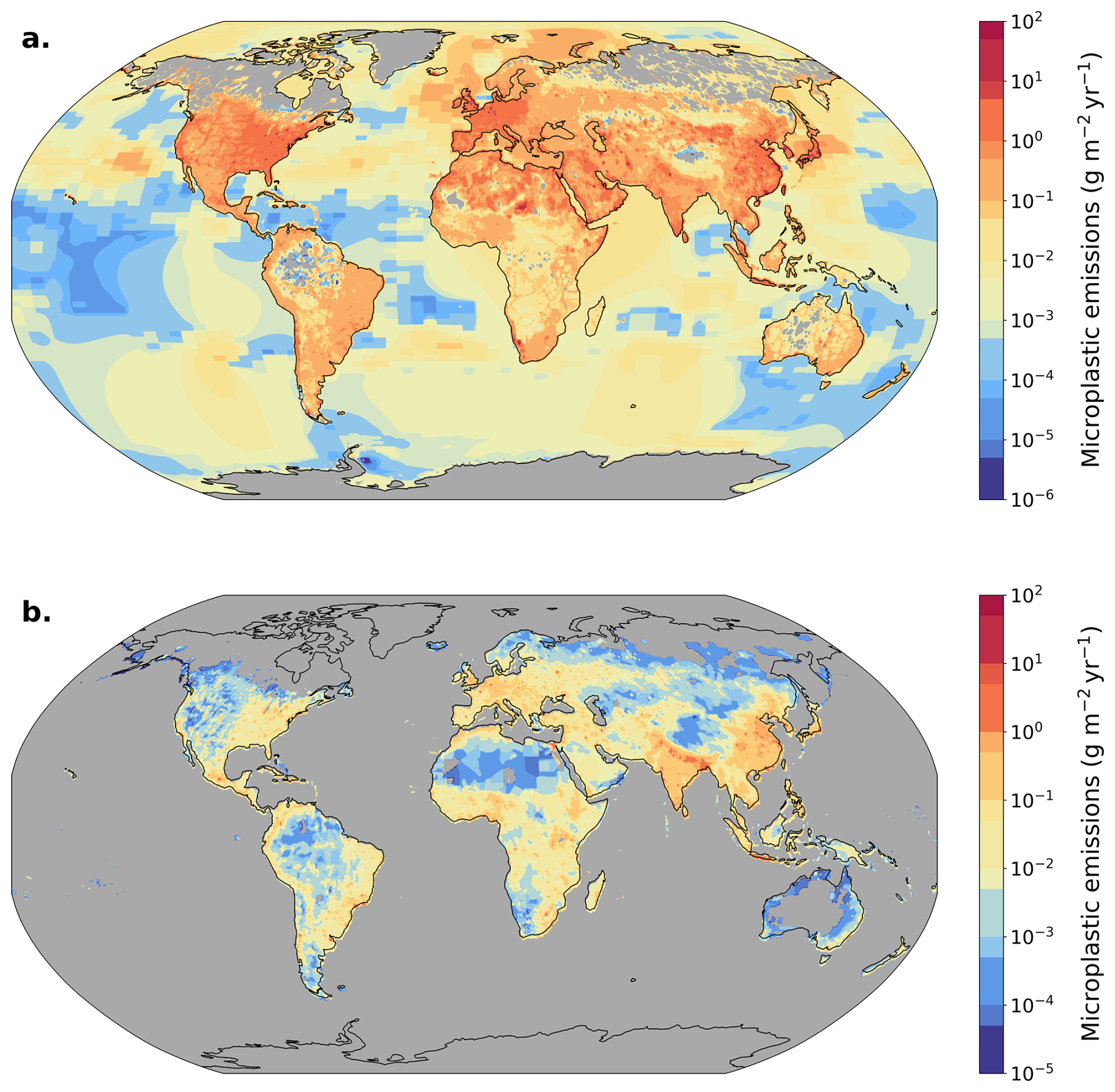 Figure 1The microplastic emissions inventory for (a) microplastic fragments and (b) microplastic fibres, updated from Evangeliou et al. (2022). Grey shading indicates that emissions are zero.