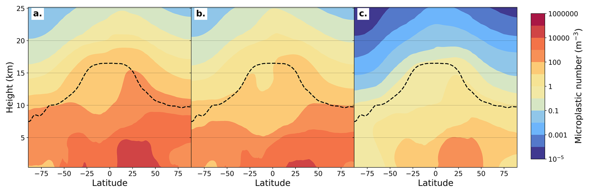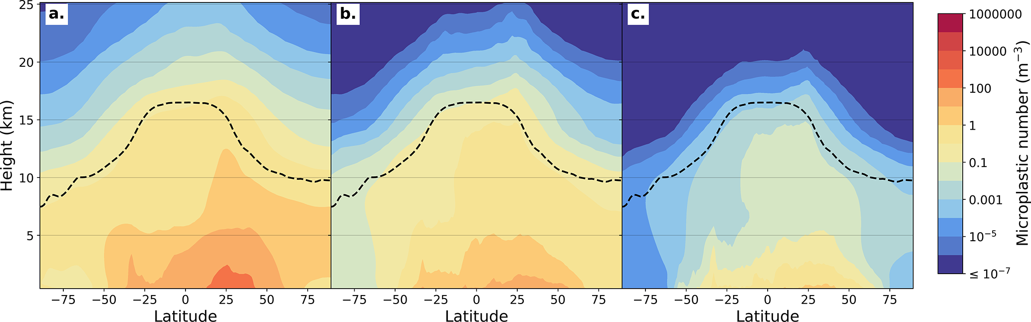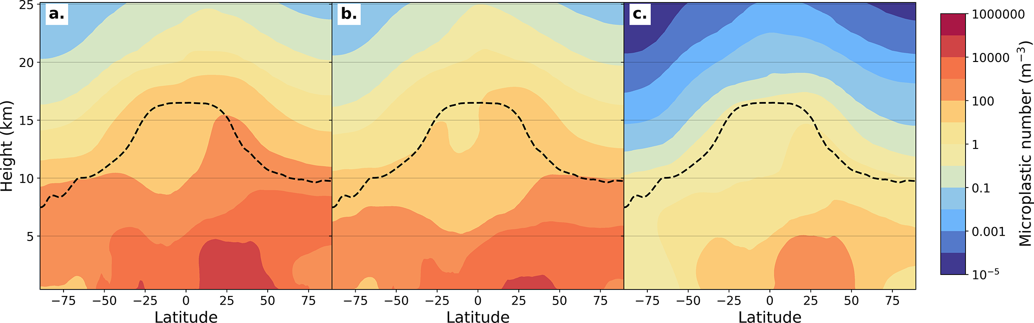 Figure 4Vertical profile of annual zonal mean microplastic fragment concentrations (2005–2014) for (a) Aitken soluble, (b) accumulation soluble, (c) coarse soluble modes. The dashed line indicates the model's annual-mean tropopause height.