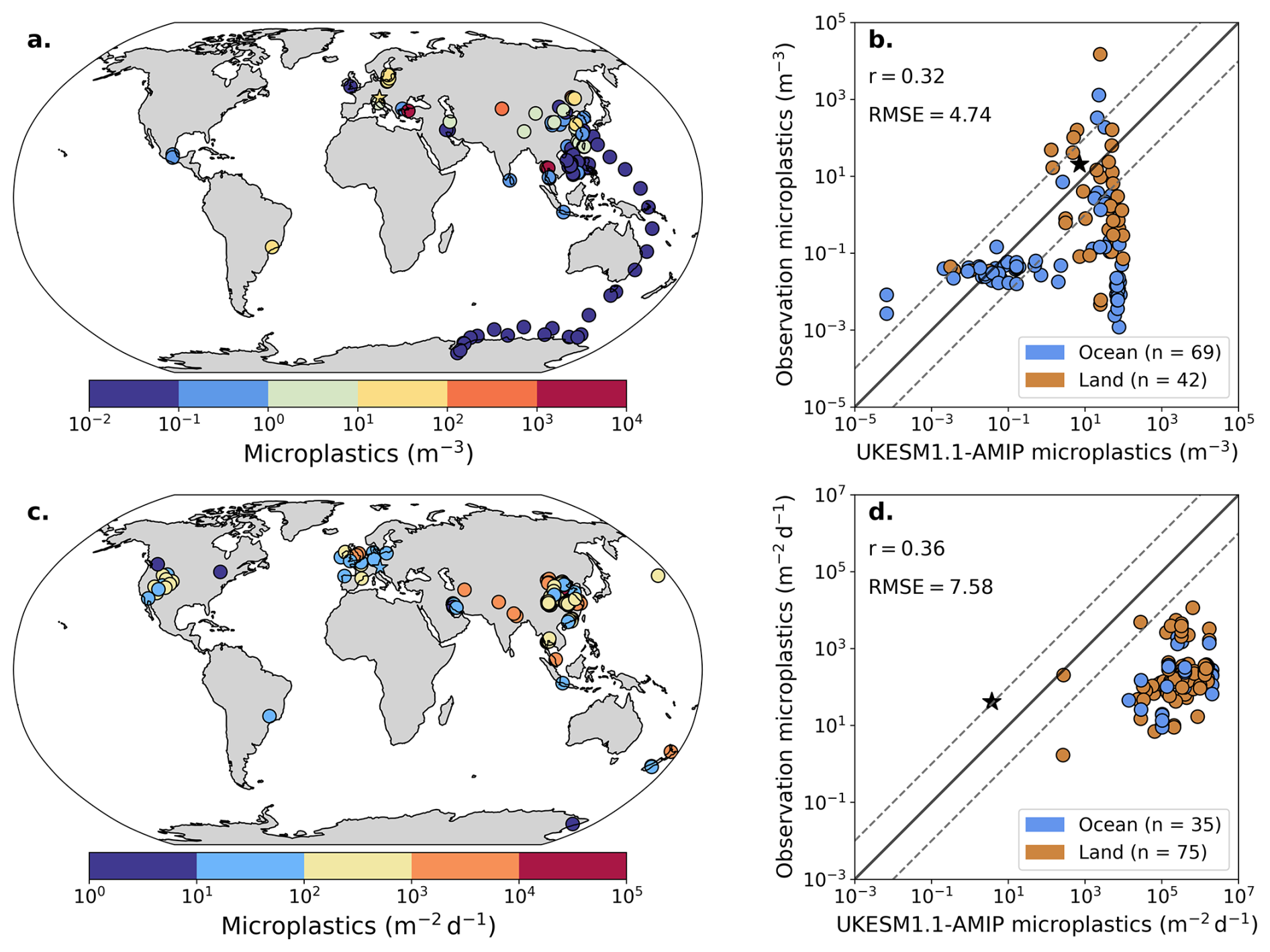 Figure 6(a) Available observational microplastic number concentrations from active sampling studies (b) Comparison of observed concentrations from (a) with UKESM1.1-AMIP surface microplastic number concentrations at the nearest model grid cell (c) Available observational microplastic deposition fluxes from deposition studies (d) Comparison of observed deposition fluxes from (c) with UKESM1.1-AMIP microplastic deposition rates (combined wet and dry) at the nearest model grid cell. The correlation coefficients (r) and root mean square errors (RMSE) across (b) and (d) are calculated in log space, for the ocean and land measurements combined. The 1:1 (solid) and (dashed) lines are plotted on (b) and (d) for reference. The star markers represent the two nanoplastics studies and related UKESM1.1-AMIP values, with units of ng m−3 for active sampling and kg km−2 yr−1 for deposition.