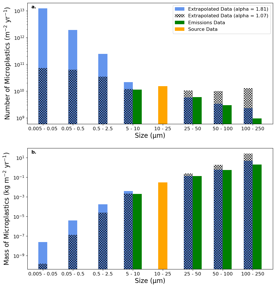 Figure A1Microplastic emissions extrapolated across varying size bins for (a) number concentration and (b) mass concentration. Green bars represent reference emissions data from (Evangeliou et al., 2022). The orange bar indicates the bin from which emissions were extrapolated for input to the model (blue bars, alpha = 1.81). The hatching indicates the lower range of the extrapolation uncertainty (alpha = 1.07).