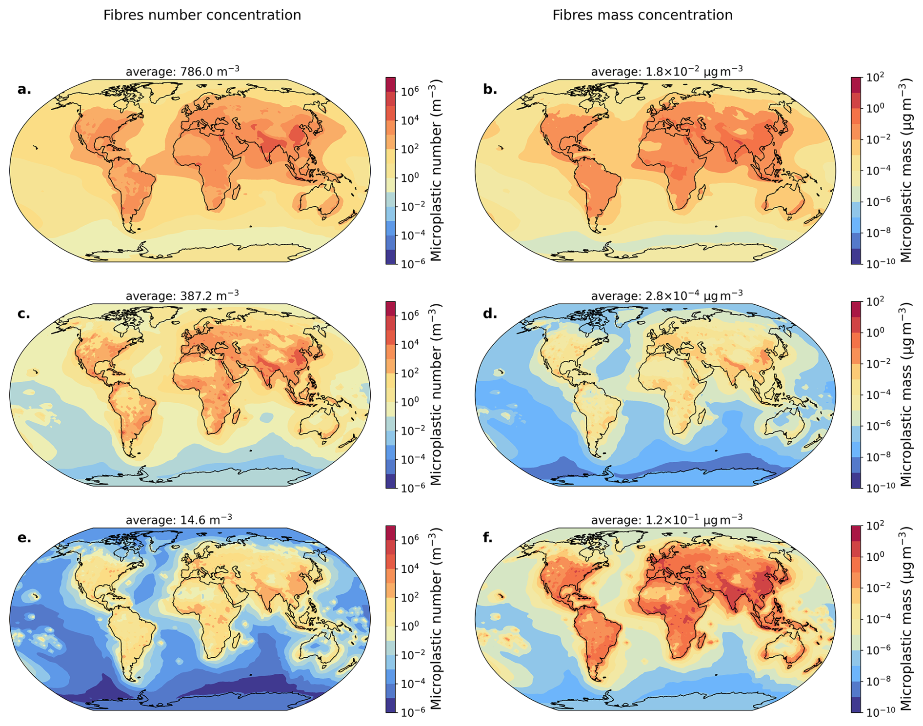 Figure 5 shows vertical profiles of number concentration for microplastic fibres for the coarse soluble, coarse insoluble and super-coarse insoluble modes. Hydrophilic, coarse soluble mode fibres are present throughout the troposphere. They also reach the stratosphere in small concentrations, decreasing below a concentration of 1 m−3 around 16 km. Super-coarse insoluble mode fibres are mostly contained near the surface in large concentrations.