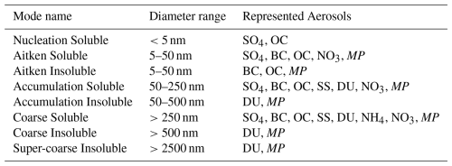 Table 1Description of the eight log-normal size modes in GLOMAP and aerosol species represented in each mode. Aerosols in UKESM1.1 soluble modes are hydrophilic, and aerosol in UKESM1.1 insoluble modes are hydrophobic. Current species are sulphate (SO4) in the form of sulphuric acid, black carbon (BC), organic carbon (OC) in the form of organic matter (OM) with an OM:OC ratio of 1:4, sea salt (SS), nitrate (NO3; in the form of ammonium nitrate in the Aitken and accumulation soluble modes, and in the form of sodium nitrate in the accumulation and coarse soluble modes), dust (DU). The new microplastic aerosol species (MP) is represented in all modes except the nucleation mode, (see Sect. 2.4).