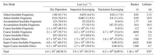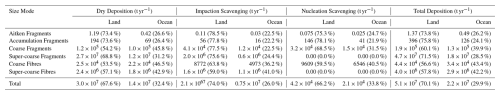 Table 3Global annual mean microplastic (fragments and fibres) aerosol budget showing deposition processes, burden in tonnes (1 t = 1000 kg), and lifetime across GLOMAP aerosol size modes in UKESM1.1-AMIP. Wet deposition can be calculated here as the sum of impaction scavenging (washout) and nucleation scavenging (rainout). Percentages indicate the total fraction of loss that each pathway is responsible for within each size mode. Fibres are only present in the coarse soluble, coarse insoluble, and super-coarse insoluble modes.