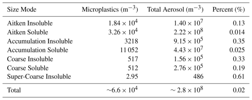 Table 5Global annual-mean number concentrations of microplastic (fragments and fibres combined) and total aerosol particles (m−3) across GLOMAP aerosol size modes in UKESM1.1-AMIP. The percentage that microplastic contribute to total aerosol is also displayed.