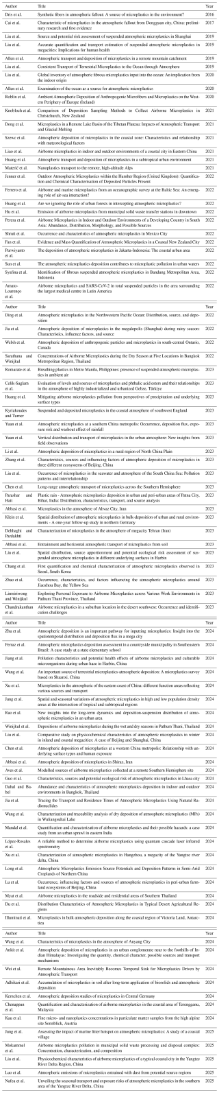 Rao, W., Fan, Y., Li, H., Qian, X., and Liu, T.: New insights into the long-term dynamics and deposition-suspension distribution of atmospheric microplastics in an urban area, Journal of Hazardous Materials, 463, 132860, https://doi.org/10.1016/j.jhazmat.2023.132860, 2024. a