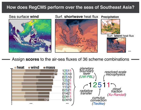In this context, we aim to thoroughly evaluate the performance of RegCM5 and its many new physics options in simulating air–sea exchanges over the SEA region. This assessment seeks to provide guidance for choosing optimal physics configurations in future use of the model, including future regional climate projections and air–sea coupling. The remainder of this article is organized as follows. Section 2 provides a description of RegCM5 and details the methodology. Then, Sect. 3 presents the results. Lastly, Sect. 4 provides conclusions.