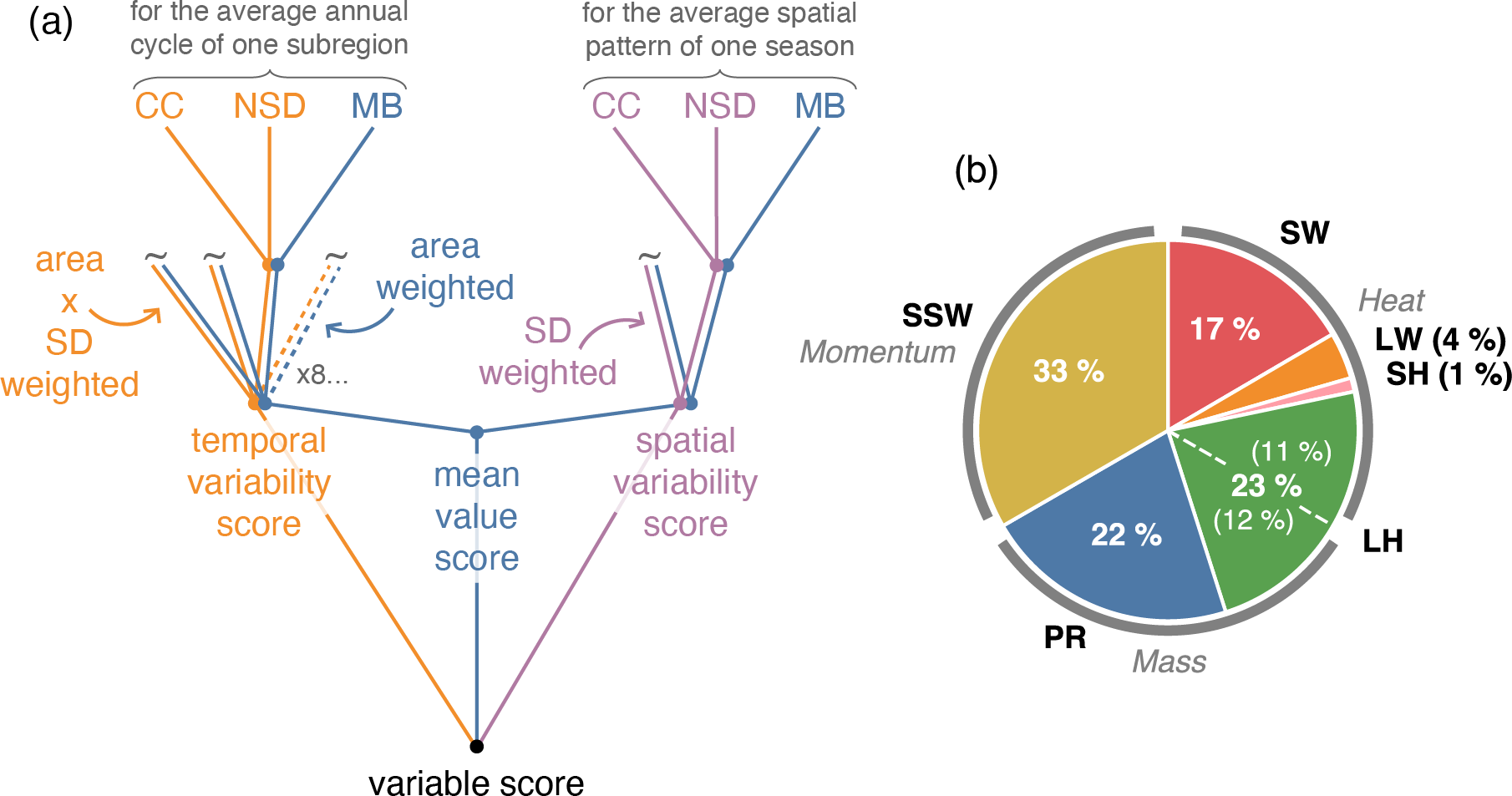 Figure 2b then illustrates the weights used for the variable scores at the highest level of the hierarchy. These weights are computed by flux type (heat, mass and momentum are weighted equally) using a representation of the variables' contribution to these fluxes. Referring to the ocean-only spatio-temporal series from the comparison datasets, we consider the sum of their mean and SD to account for each variable's relative contribution. For example, calculation for the weight wSW given to SW yields: