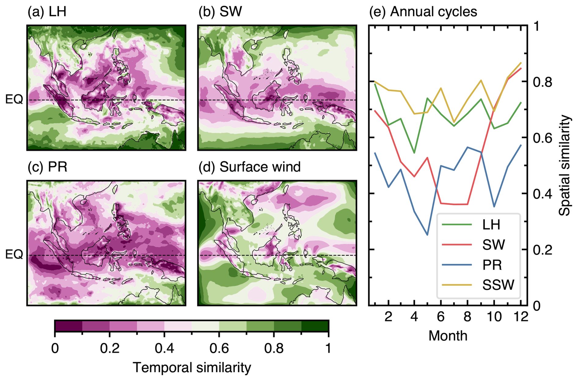 Figure 4(a–d) Spatial distribution of the ensemble's temporal similarity index for LH, SW, PR and surface wind. (e) Monthly annual cycles of the ensemble's ocean-only spatial similarity index for LH, SW, PR and SSW.